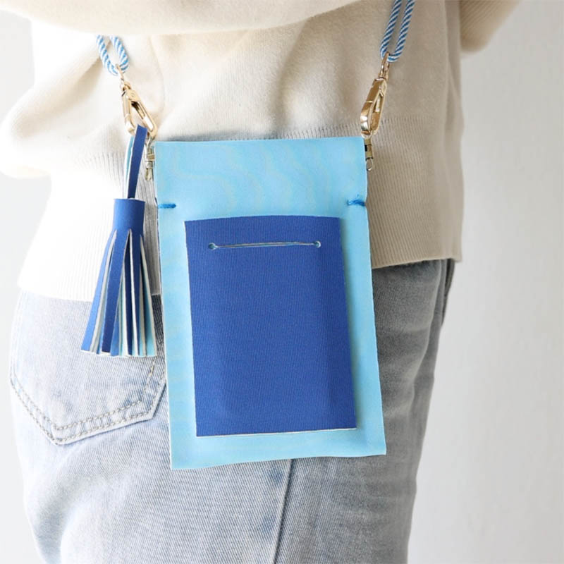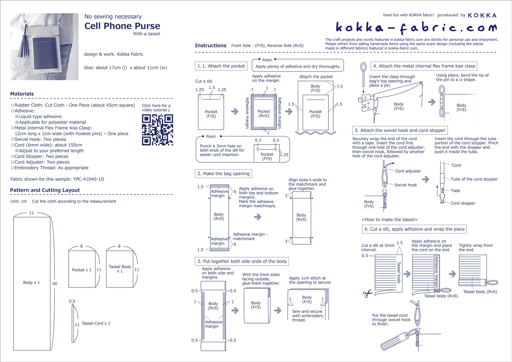This cell phone purse is made without using a sewing machine. A pad-like new fabric called “rubber cloth” makes a sewing-free process possible. With padding, this fabric is ideal for cell phone and tablet cases. As cut edges won’t fray like fabrics, you can enjoy sewing like paper crafts. Being reversible, there is no need for lining fabric and it allows you to appreciate two different colors in one piece. The front and back polyester fabrics are combined with synthetic rubber material in the middle.