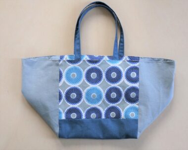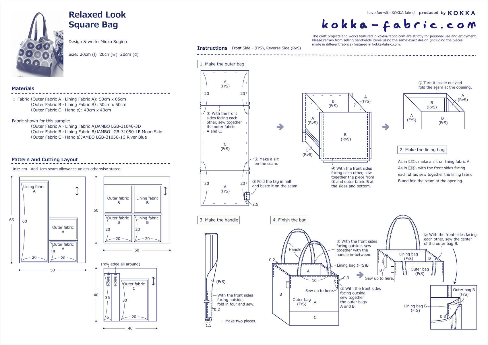 This relaxed look square bag features a fabric from the JAMBO series. The colors work perfectly together as both solid and patterned pieces are from the series. The soft texture of cotton linen sheeting allows you to create this bag without the use of the interfacing.