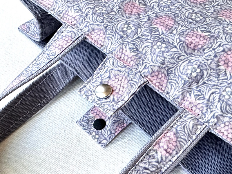 When applying top stitches on the corners, be sure to fold the outer and lining fabrics tightly together. The finished bag will be beautiful if the lining fabric is carefully sewn without being separated. In place of the Plasnap closure, you may use Velcro or magnetic hook. It is also cute to use a ribbon to tie the top instead of a tab.