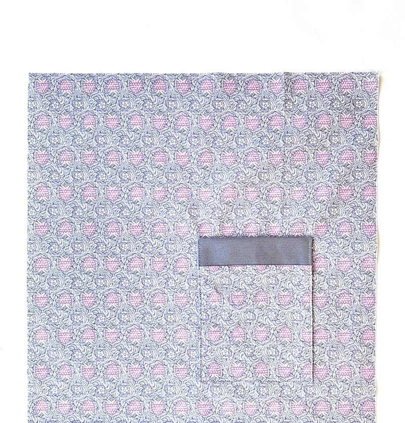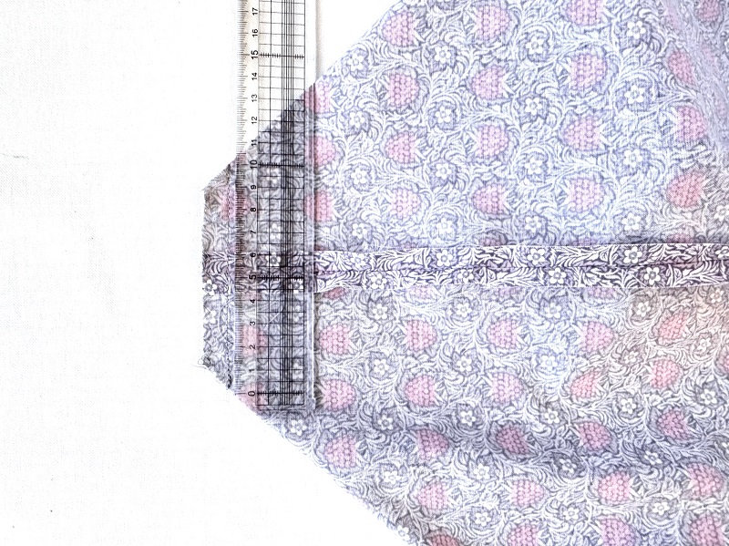With the front sides facing each other, sew together the pocket opening fabric and pocket fabric. Press down the seam to the pocket fabric side.