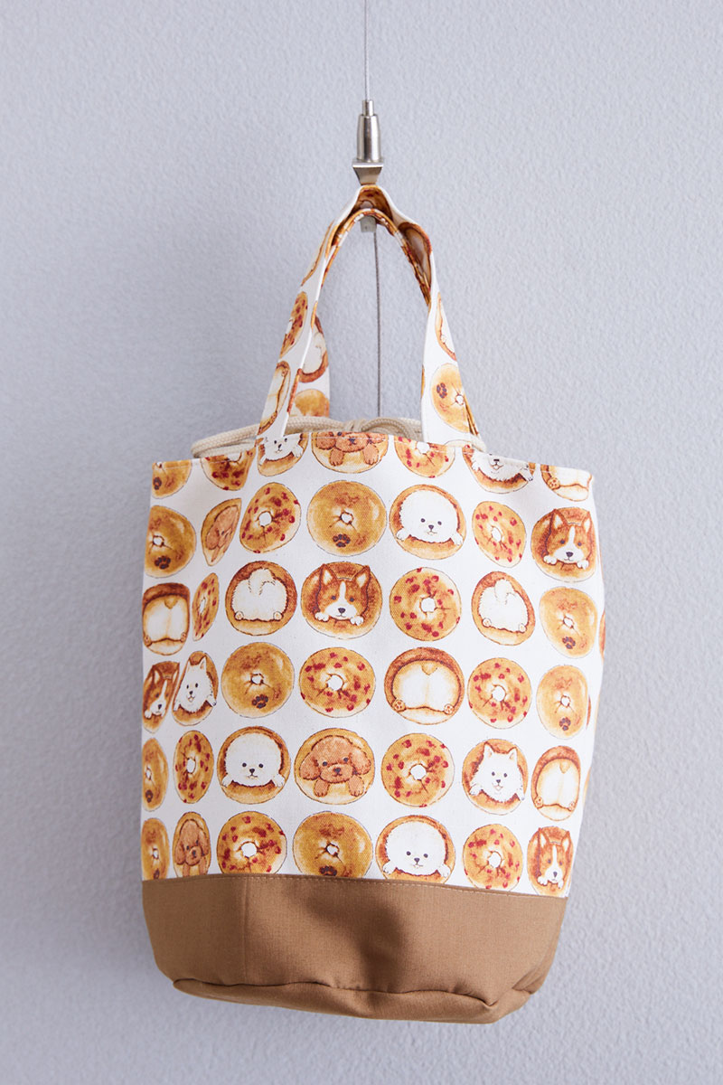 This small supplemental bag has a drawstring closure. With an 18cm-diameter round bottom, a lunch box can be placed flat in it. The fabric used for this bag is from the “ANIMAL BREAD” series. The bread motifs are decorated with adorable animals. The 100% cotton oxford fabric is easy to sew and perfect for sewing beginners.