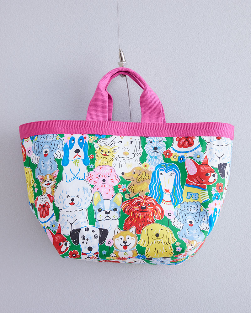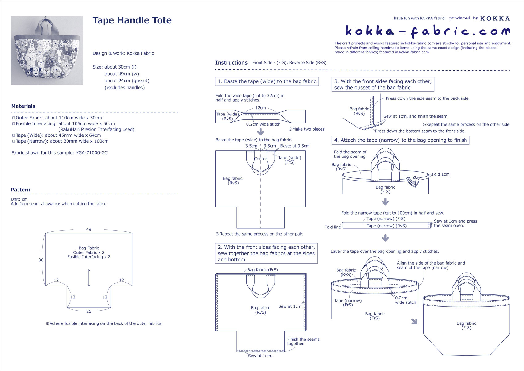 This tote bag features a tape for its handle. Easy to sew on, handle tape is a perfect material for sewing beginners. Available in a wide variety of colors, it gives an accent to this lively fabric filled with motifs. The fabric used for this bag is from the “Powerful animal” series, which introduces strong animals all over the fabric. The 100% cotton oxford is easy to sew and suitable for bag making.