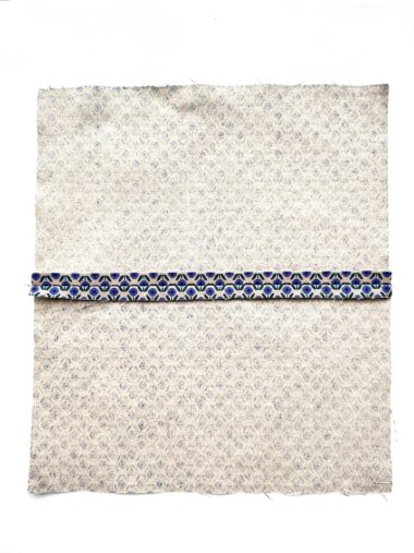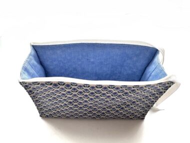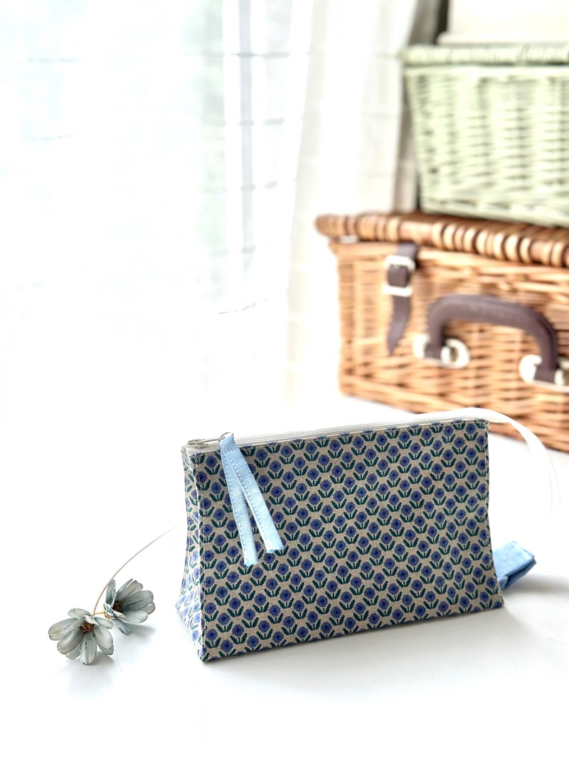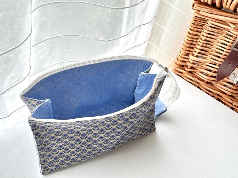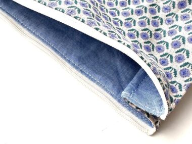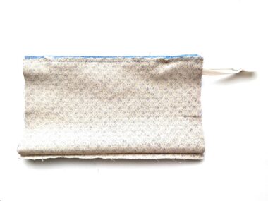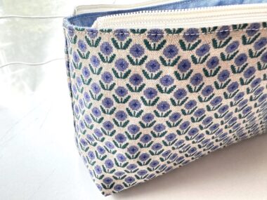 This is a pouch with a long zipper as a handle. The edge and decorative fabrics for the zipper are accented with the same light blue color of the lining fabric. The fabric used for this pouch is from the “Sashiko Moyou” series. The design features small motifs from the sashiko embroidery, a popular old-fashioned Japanese needle craft. The moderately thick cotton linen canvas is suitable for making bags and pouches.