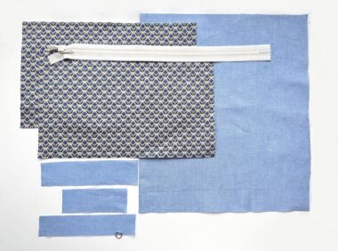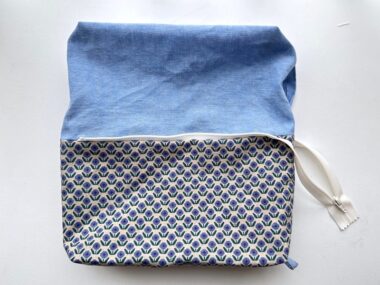 To create this shape nicely, the featured zipper is longer than the width of the pouch. The extra length of the zipper is conveniently turned into a handle. The addition of the light blue fabric to the zipper end and loop acts as another accent.