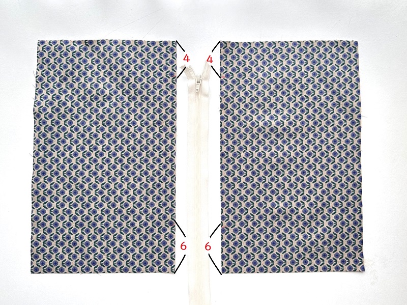 With the front sides facing each other, put together the piece from 3 and lining fabric. Sew together up to where the opening stops, slide the zipper to the inner side, and sew all the way to the end.