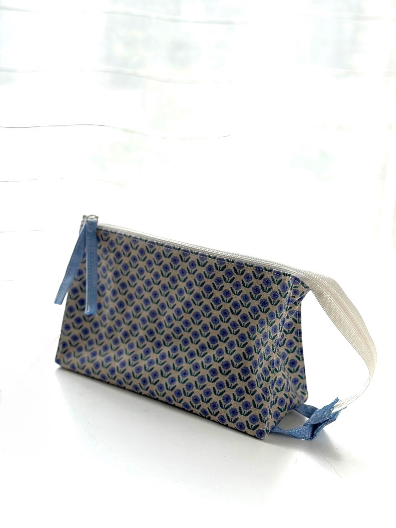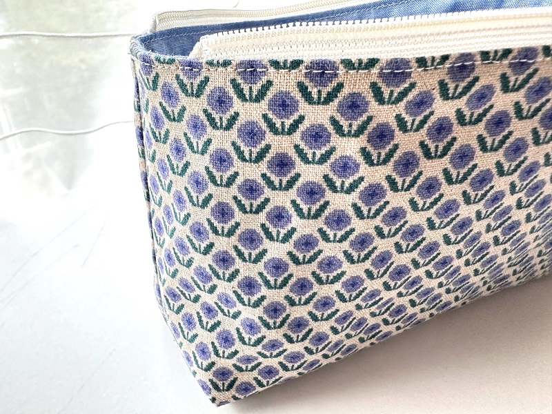 This is a pouch with a long zipper as a handle. The edge and decorative fabrics for the zipper are accented with the same light blue color of the lining fabric. The fabric used for this pouch is from the “Sashiko Moyou” series. The design features small motifs from the sashiko embroidery, a popular old-fashioned Japanese needle craft. The moderately thick cotton linen canvas is suitable for making bags and pouches.