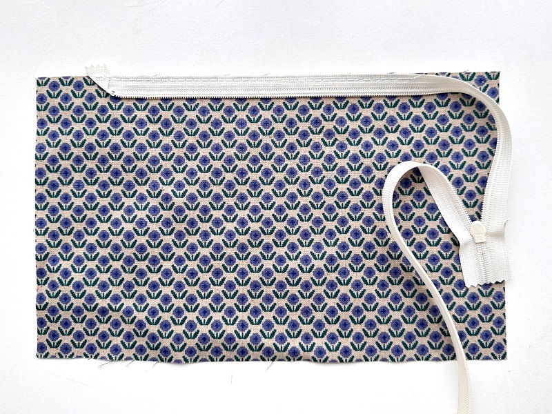 To create this shape nicely, the featured zipper is longer than the width of the pouch. The extra length of the zipper is conveniently turned into a handle. The addition of the light blue fabric to the zipper end and loop acts as another accent.