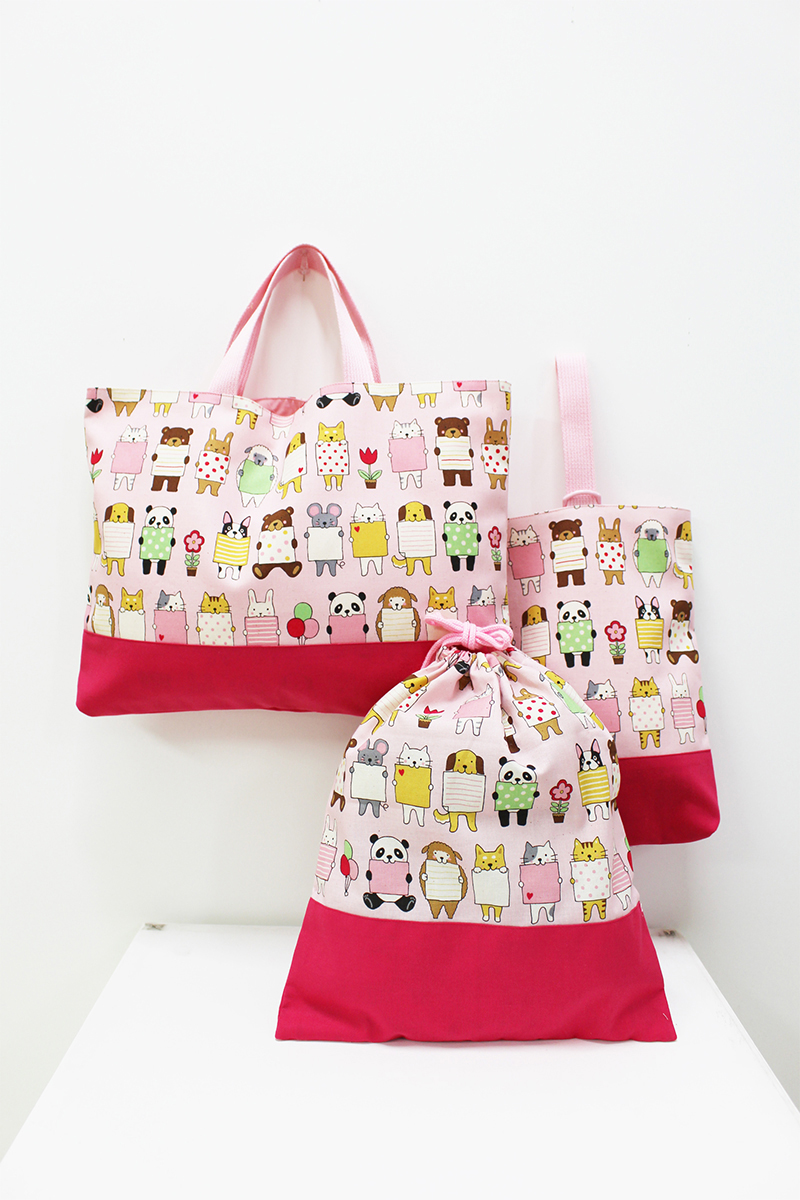 It is time to get ready for the new school year with handmade essentials! A three-piece set of a lesson bag, shoe case and gym clothes bag are created with 100% cotton sheeting fabric from the Message for you series. The design features a lined-up group of lovely animals holding a message board. This fabric is easy to sew, a perfect fit for sewing beginners.