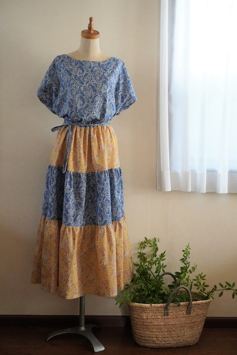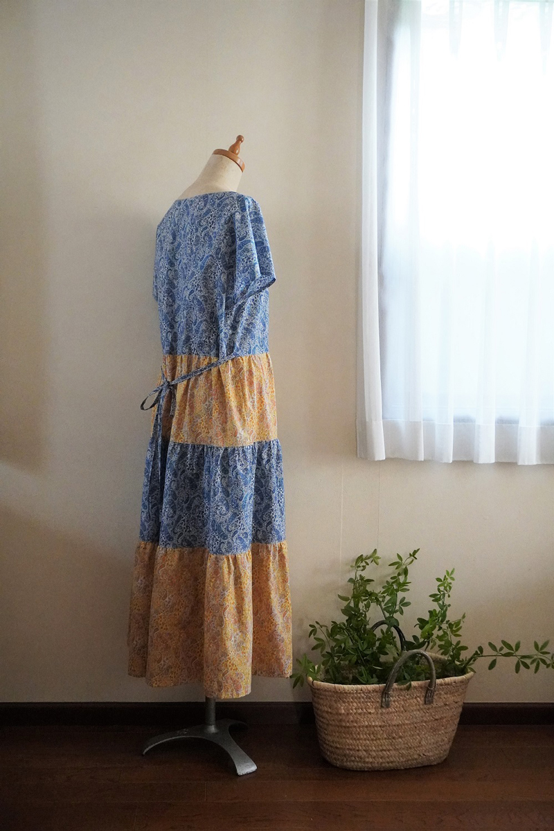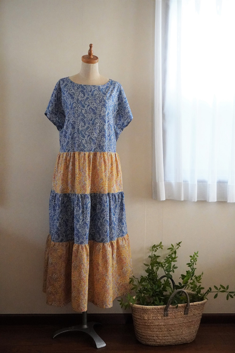 This is a light, tiered dress that is perfect to enjoy in the coming season. The three-tiered skirt with a reduced amount of gathers is not too cute and is well suited for grown women who are young at heart. The fabric used is from the “Flownny” series. It is a lawn fabric that is easy to use for making clothing. There are many color combinations of the same pattern, so you can find fun in mixing a pattern with another pattern.