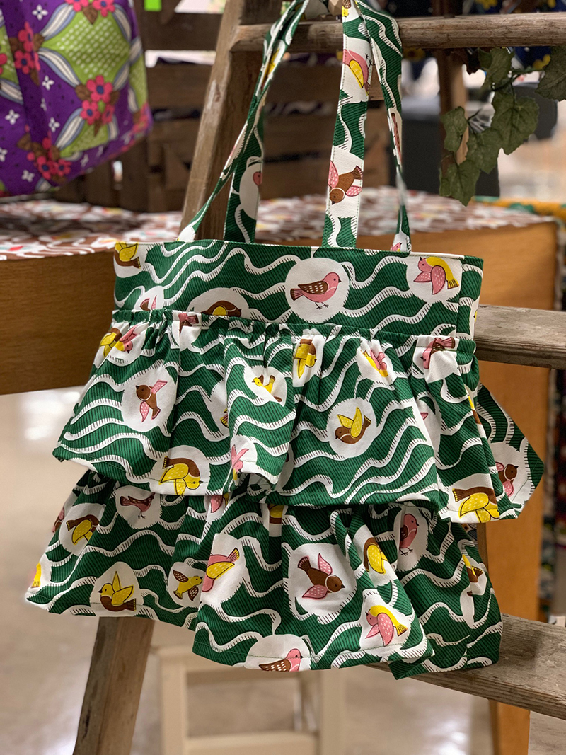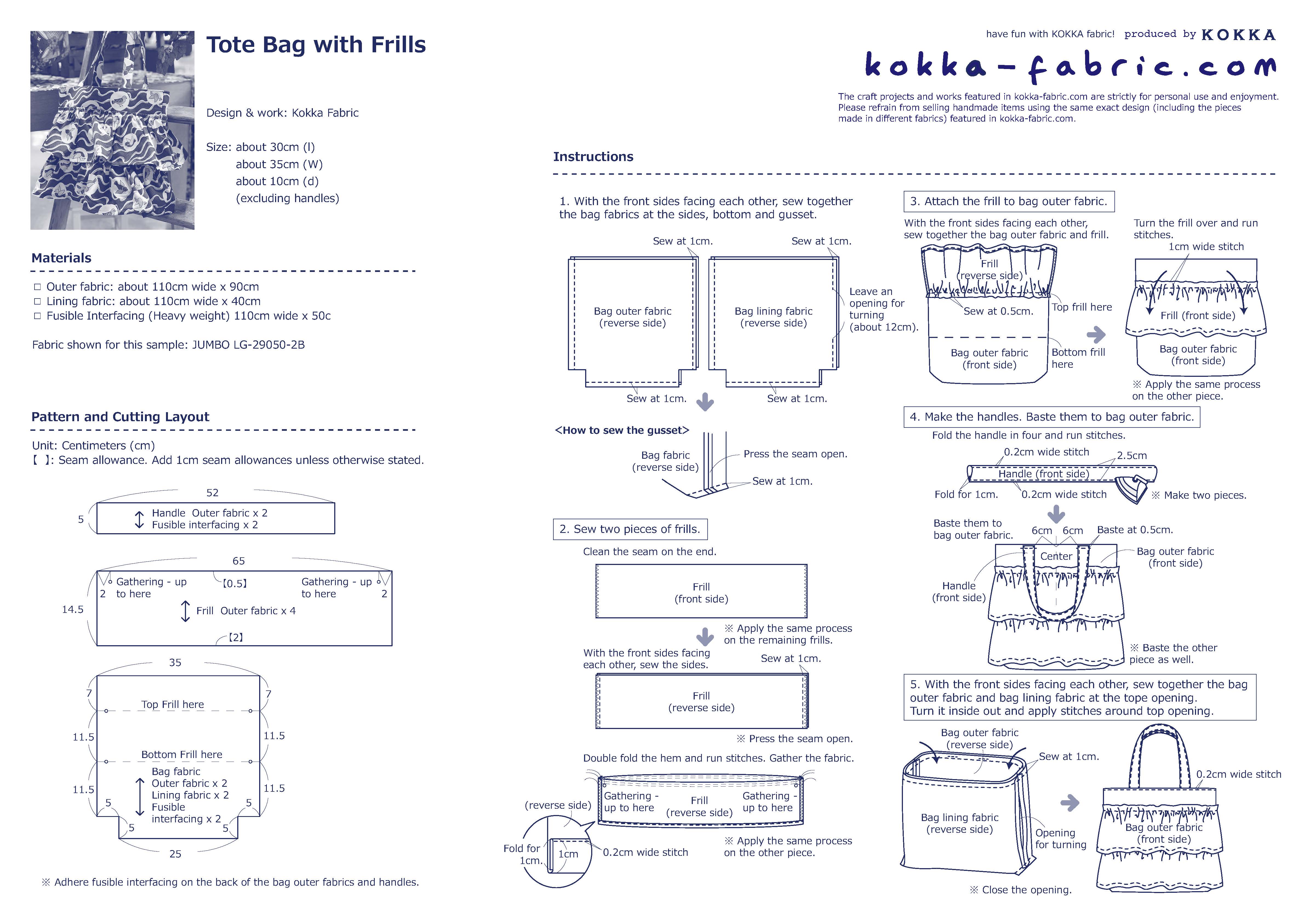 This frilled tote bag will make your outing so much fun! The cotton 100% twill fabric is from a series called JUMBO, which means “hello.” As the name depicts, this energetic and lively print is great for making bags and interior décor accessories.