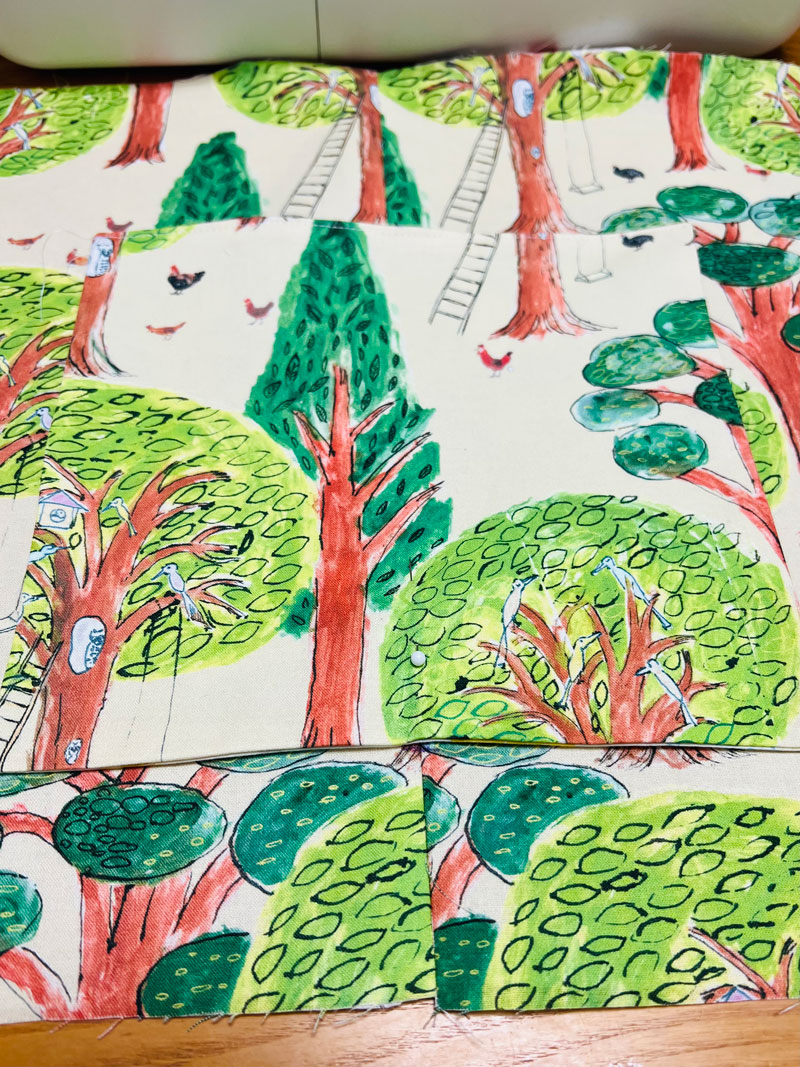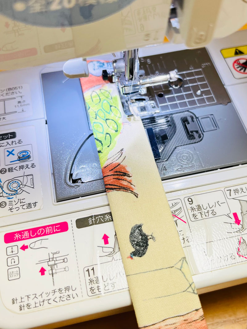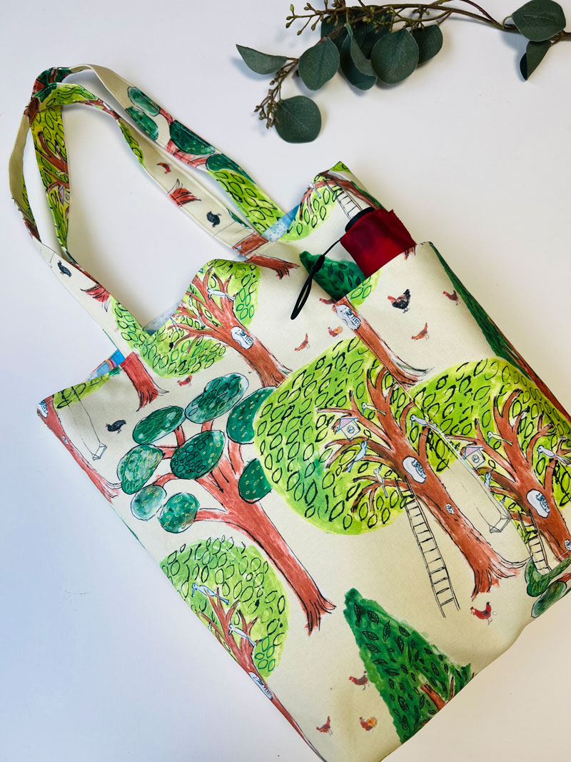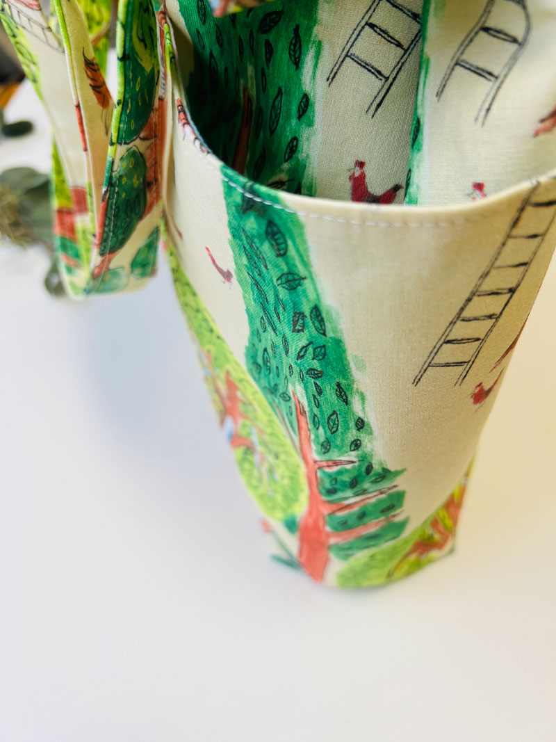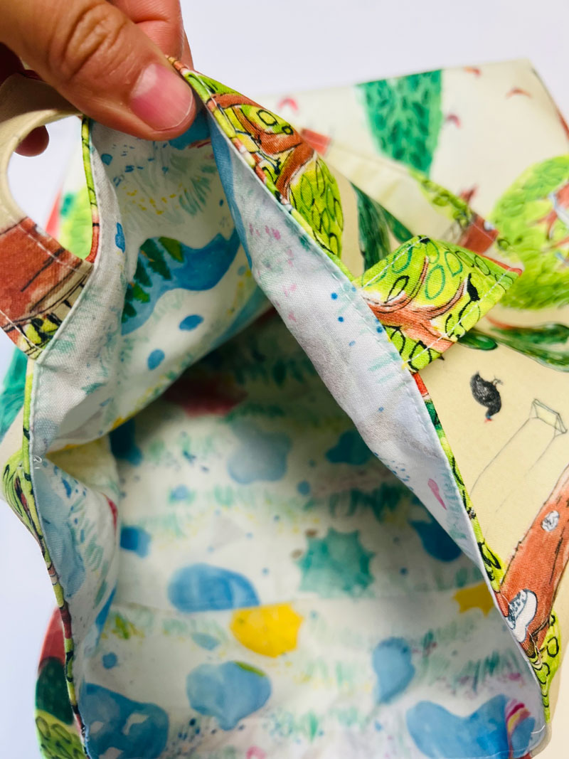 This tote bag with an outside pocket can easily hold a water bottle or foldable umbrella, making it perfect for outings or walks. The fabric used for this bag is the fourth collaboration between Kokka and Paper Message, a paper goods store in Kochi that explores the charm of paper and printing. The outer fabric features a design of birds in a cozy forest called “birdhouse,” while the lining fabric showcases a design called “Skip,” which makes rainy days more enjoyable. Both are made from 100% cotton sheeting, an easy-to-sew fabric that is ideal for sewing beginners.