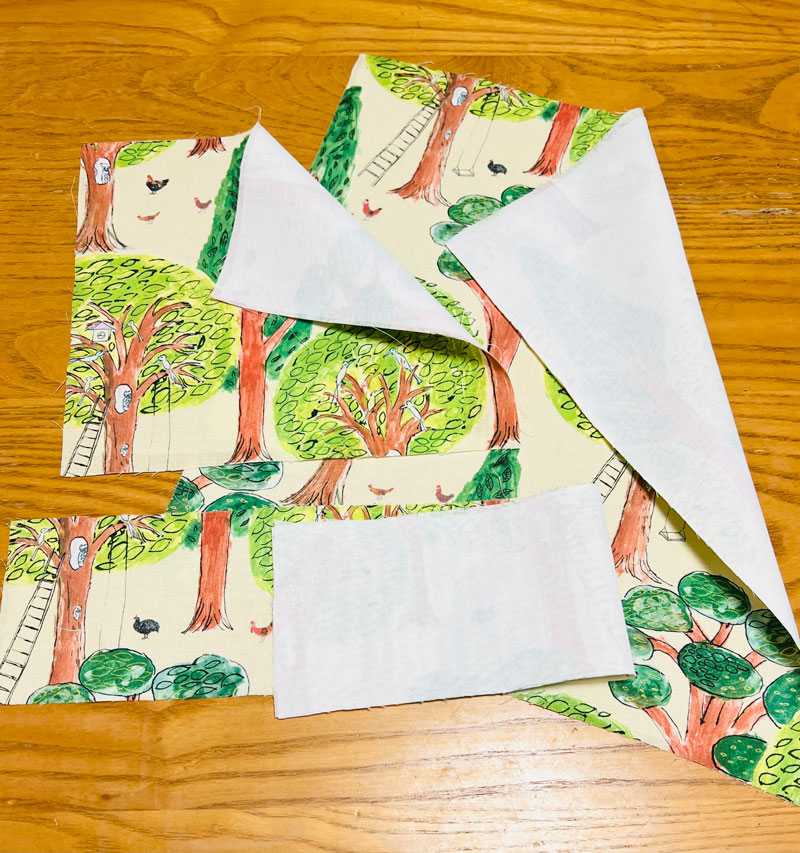 Adhere fusible interfacing on the back of the body outer fabric, pocket outer fabric and handle.