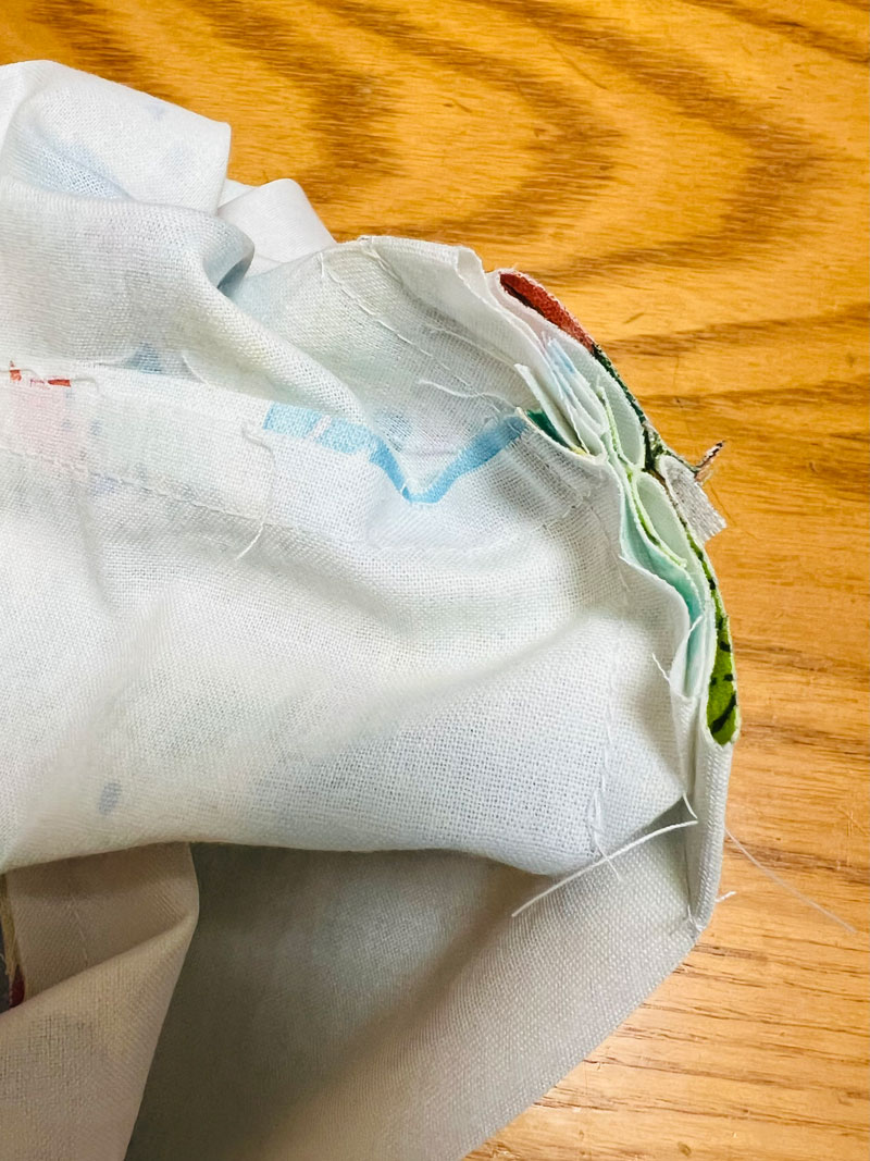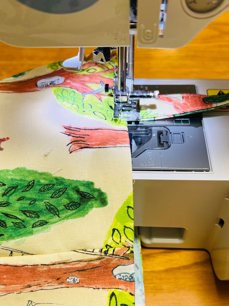 With the front sides facing each other, sew together the outer fabrics at one side.
