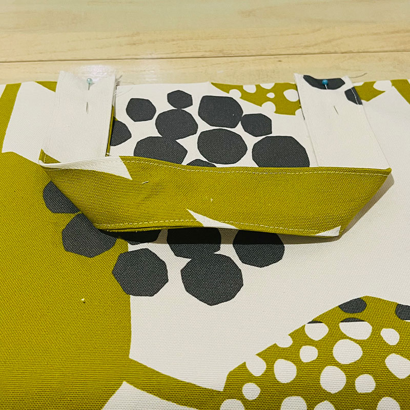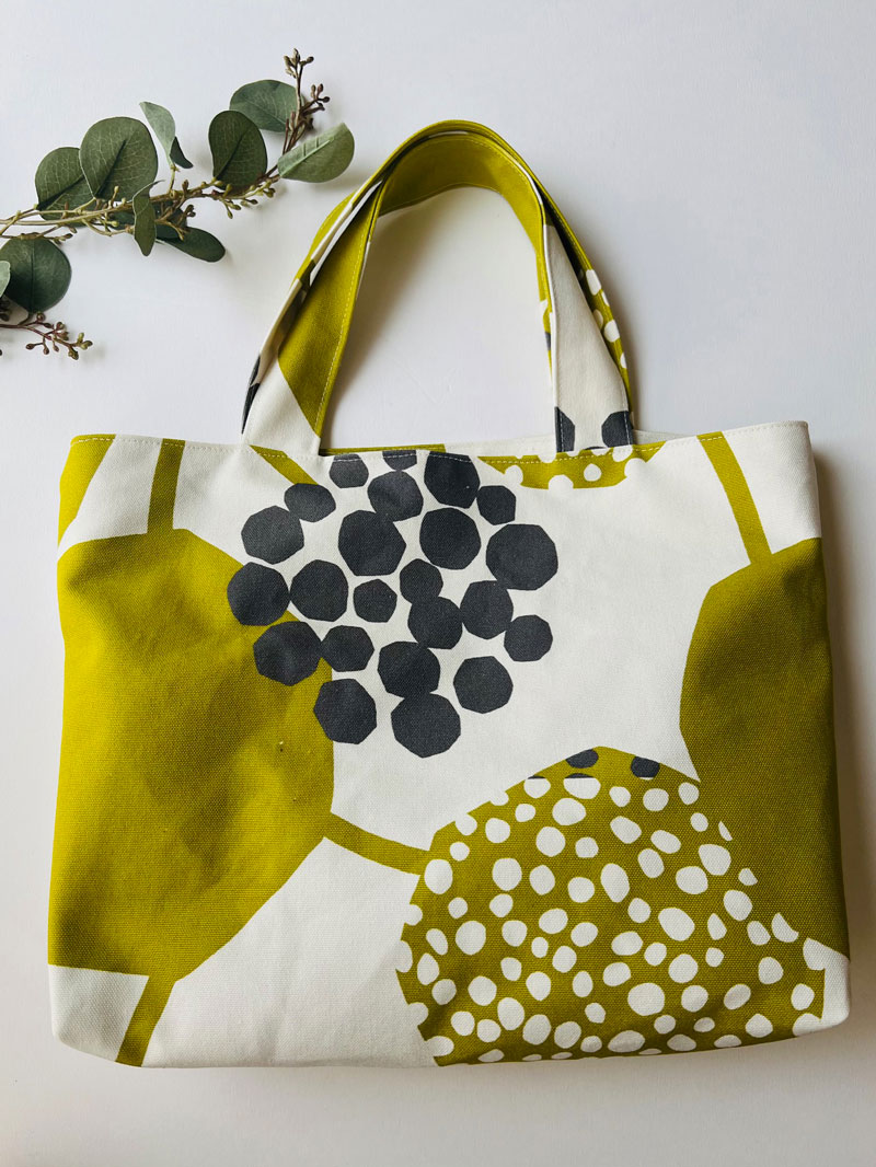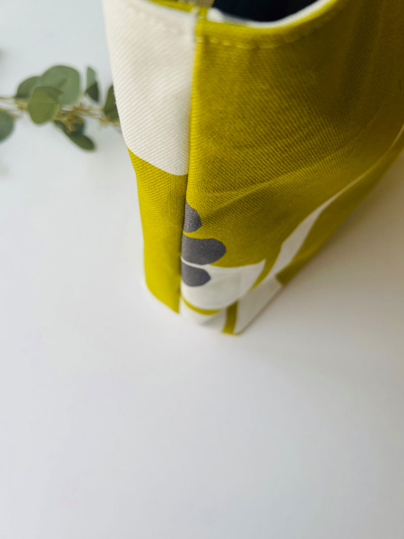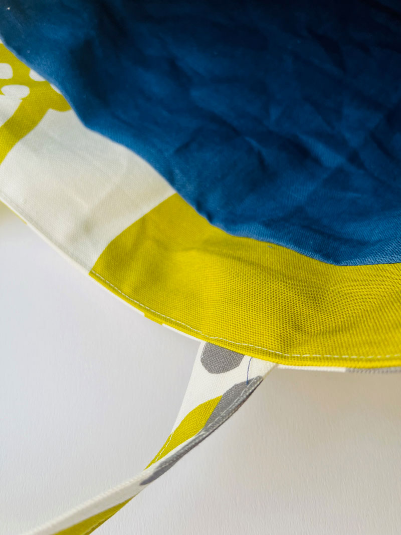 This tote bag lets you enjoy looking at its patterned outer fabric as part of the facing inside. The fabric used for this bag is echino’s new [crop] pattern, a 100% cotton #9.5 canvas. The lining features a blue fabric from the NUNO TO MONO series, a thin and easy-to-handle 100% linen fabric.