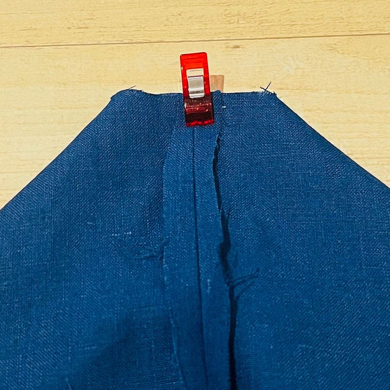 Sew the bottom of the lining fabric. For gusset, corner is opened and held with a clip.