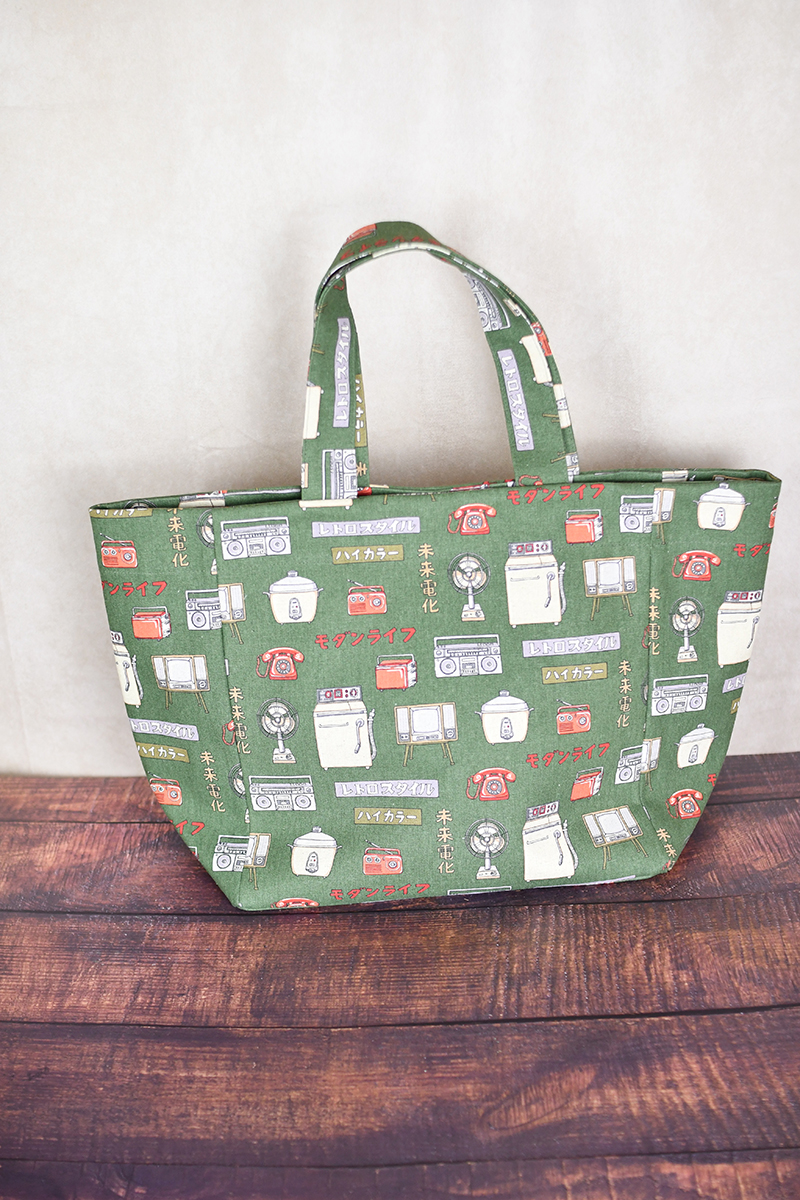 This tote bag with gusset is perfect for everyday use. Its convenient 20cm gusset allows you to carry lunch boxes and side dish containers in a flat manner. The magnetic hooks on the opening which help cover the contents is a plus. You won’t want to be without it for your daily shopping. The featured fabric is from the “Retoro Japan” series. It is a fun print with retro and nostalgic Showa-era home appliance motifs including a rice cooker, TV, and radio cassette player. 80% cotton, 20% linen.