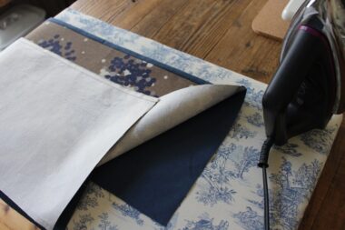 With the front sides facing each other, layer the outer pockets, and sew. (sewn at 1cm as shown) Wrap the seam allowance with the lining fabric and iron to crease.