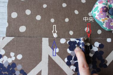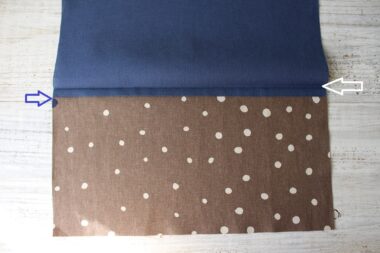 Make an inner pocket. As in Step 2, sew at 1cm from the top edge, and sew the edge where the seam allowance looks wrapped (blue arrow). The white arrow indicates the line that is wrapped with the lining fabric when layered with the front sides facing each other. Iron to creases in advance.