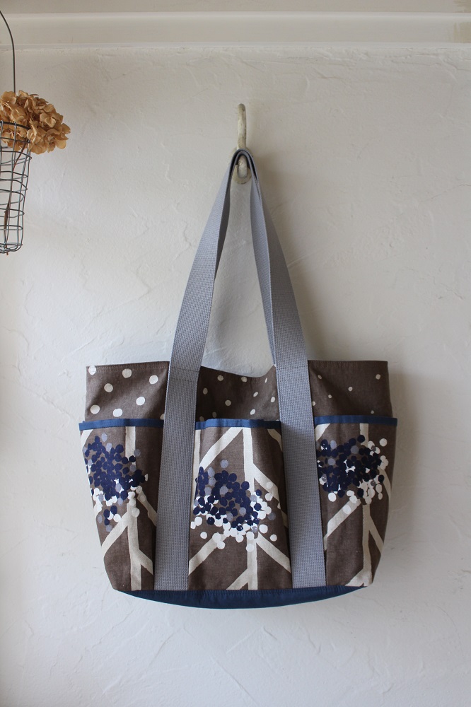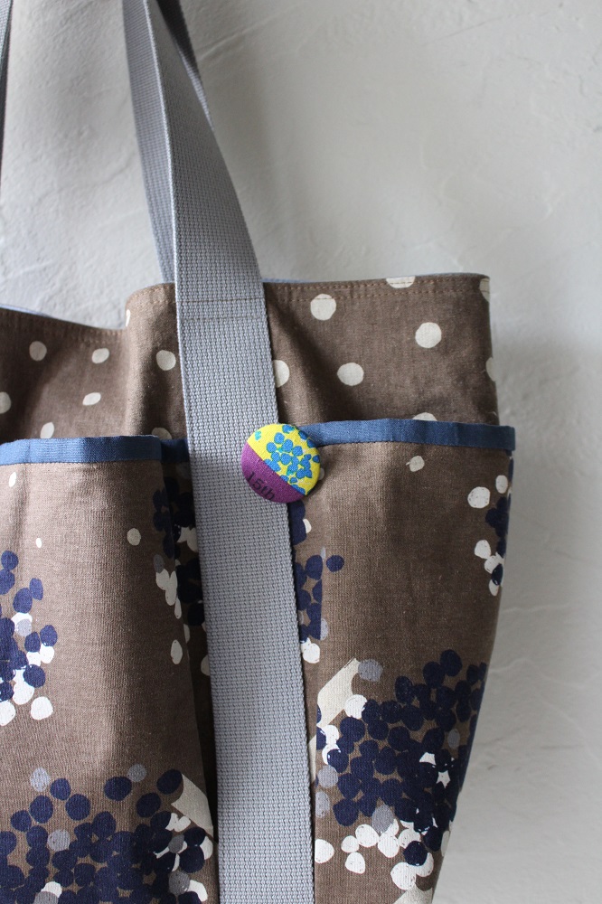 A collection of large flowers beautifully covers the outer pocket of this tote bag. The opening of the outer pocket is accented by folding back the solid dark blue-grey echino fabric used for the lining. The outer pockets around the bag are useful for sorting small items. The fabric used is a new pattern [nabana] from the series commemorating echino’s 15th anniversary. It depicts a landscape pattern of large blooming flowers growing upright.