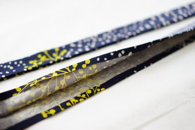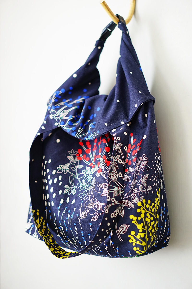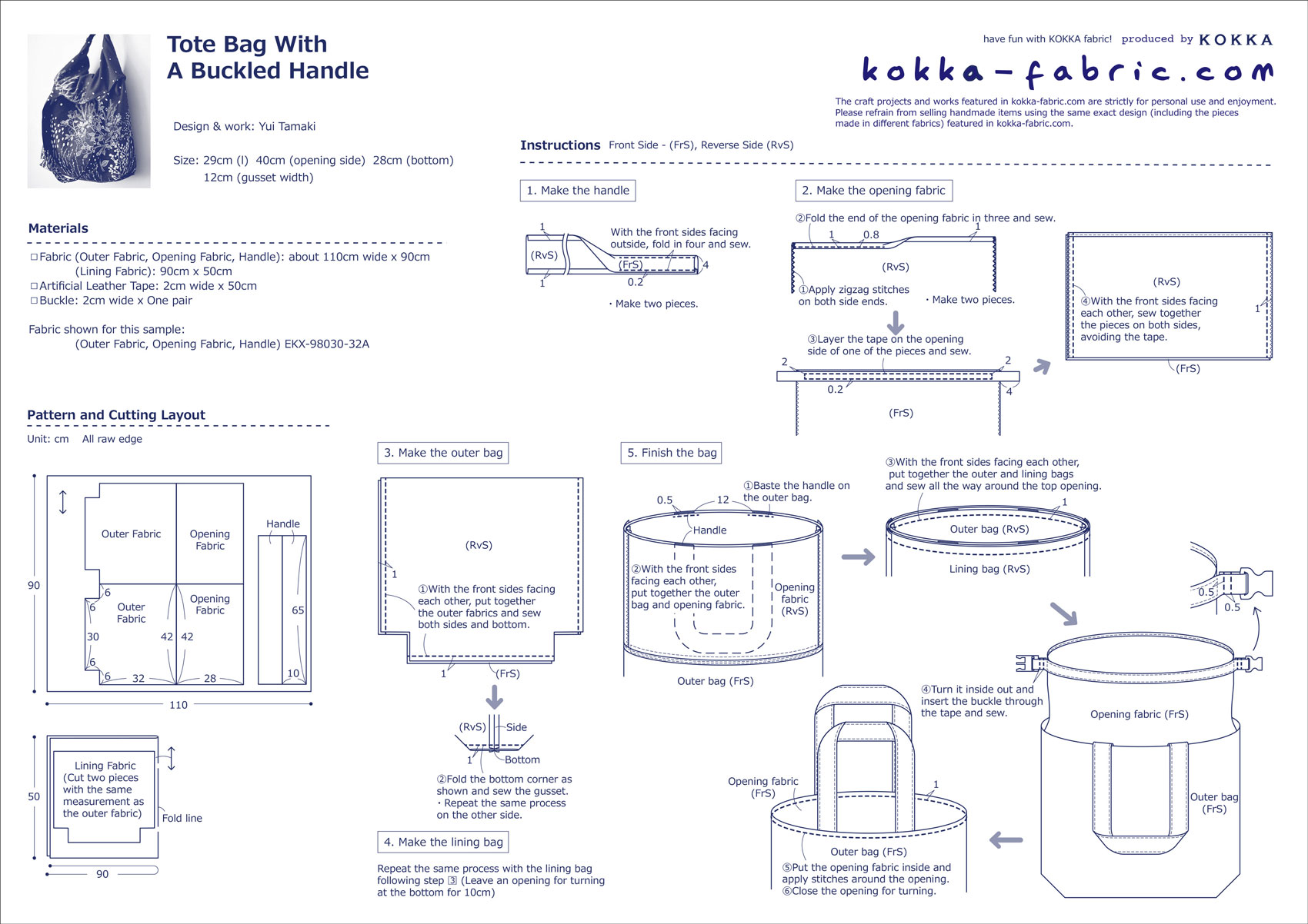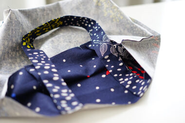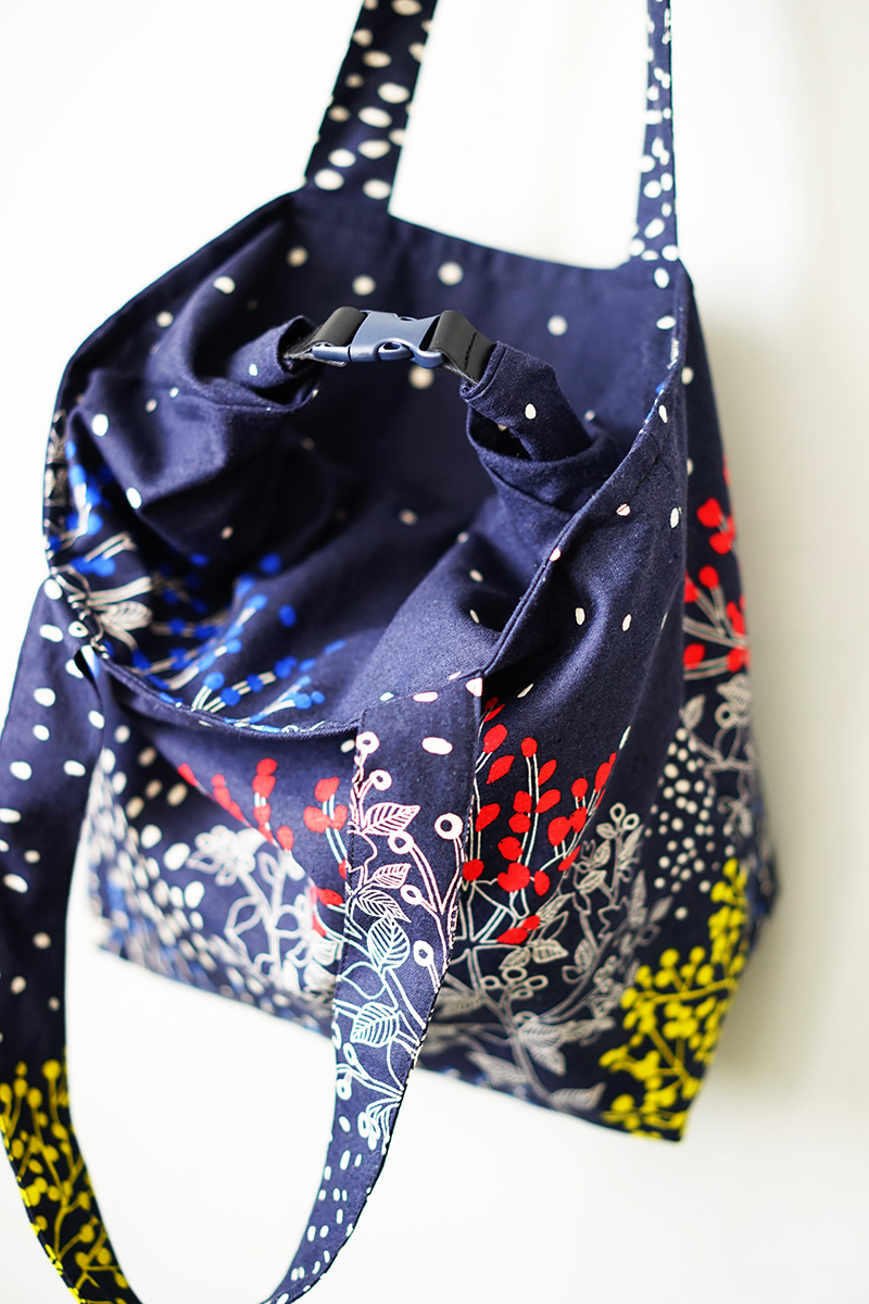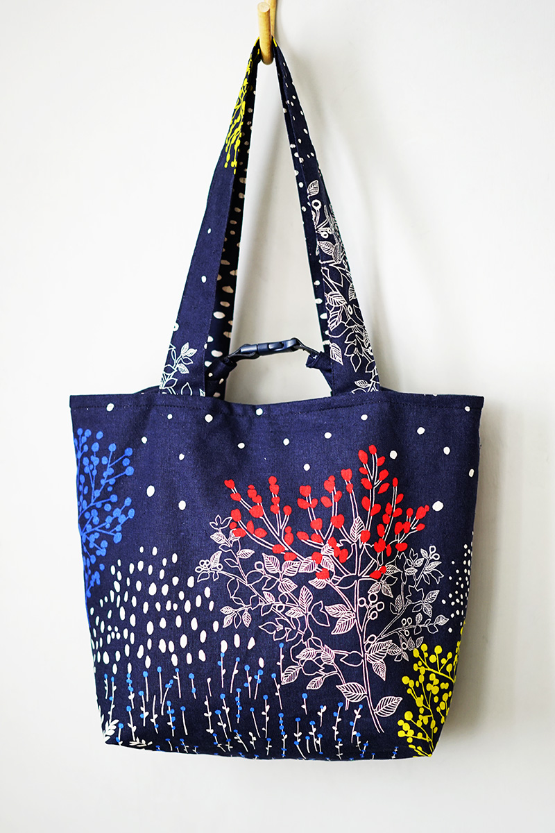 This tote bag has a buckle attached to the bag’s opening that doubles as a handle. The fabric used for this bag is [Plants], a new pattern for 2023 by echino. The textile has unique plant shapes and silhouettes spread across the entire width of the fabric. The pattern is large, so you can enjoy different looks depending on where you cut out the pattern. The solid cotton linen canvas fabric is recommended for bags as well as tablecloths and throw pillow covers.