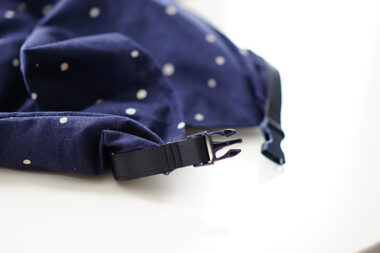 Turn it inside out. Apply stitches around the top opening. Close the opening for turning and attach the buckle to finish.