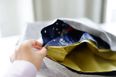 I designed this bag to be easy-to-make and to have a unique and cute shape. The solid cotton linen canvas allowed me to create a lightweight bag without applying a backing.