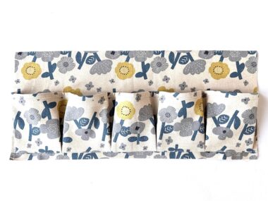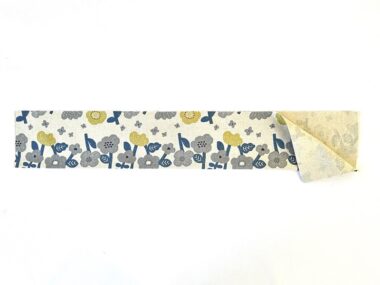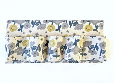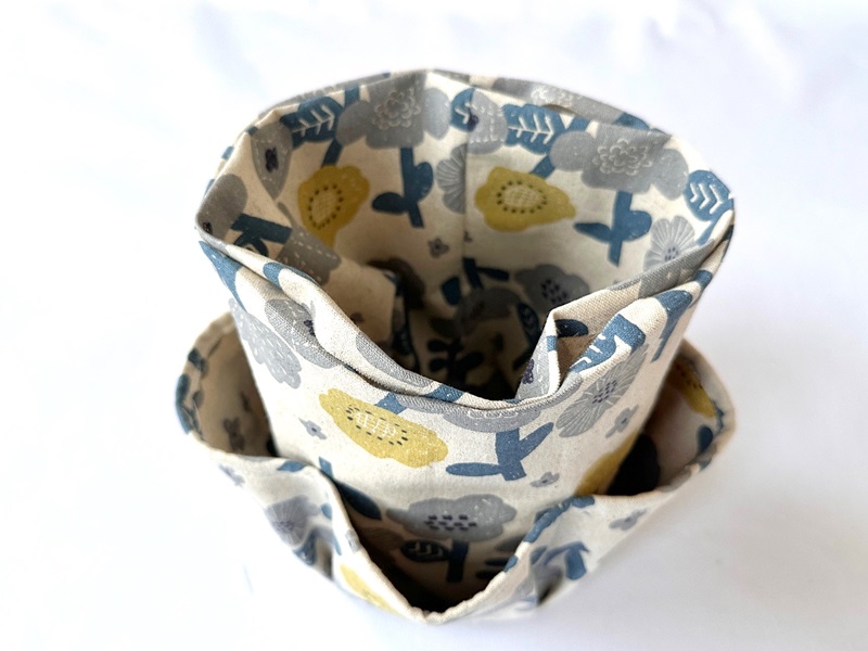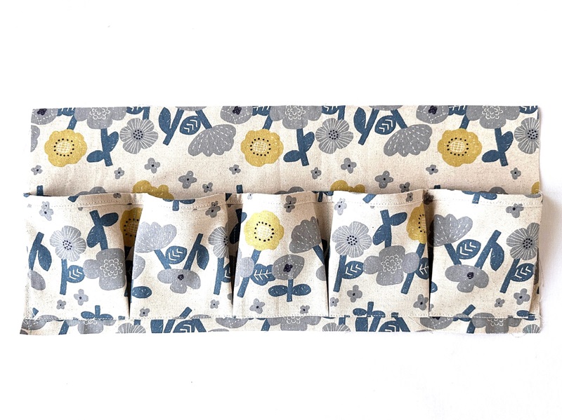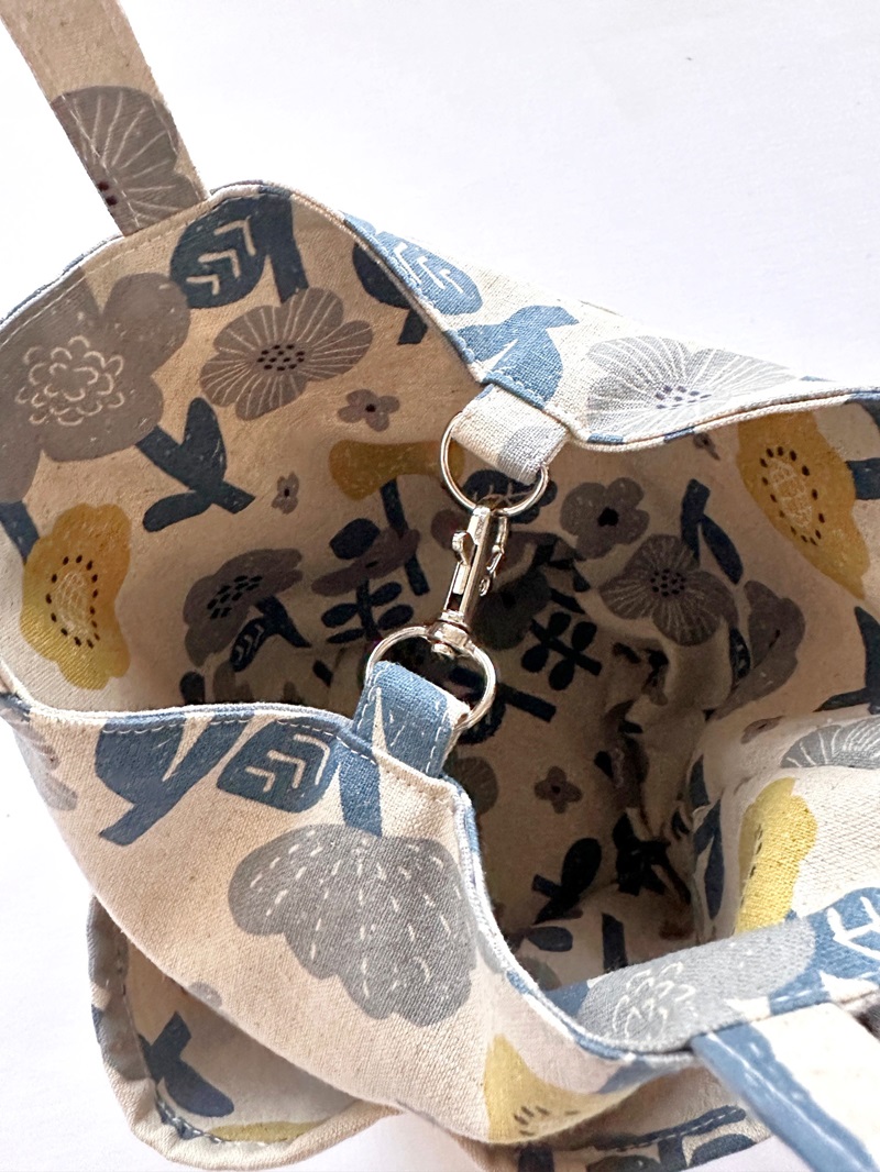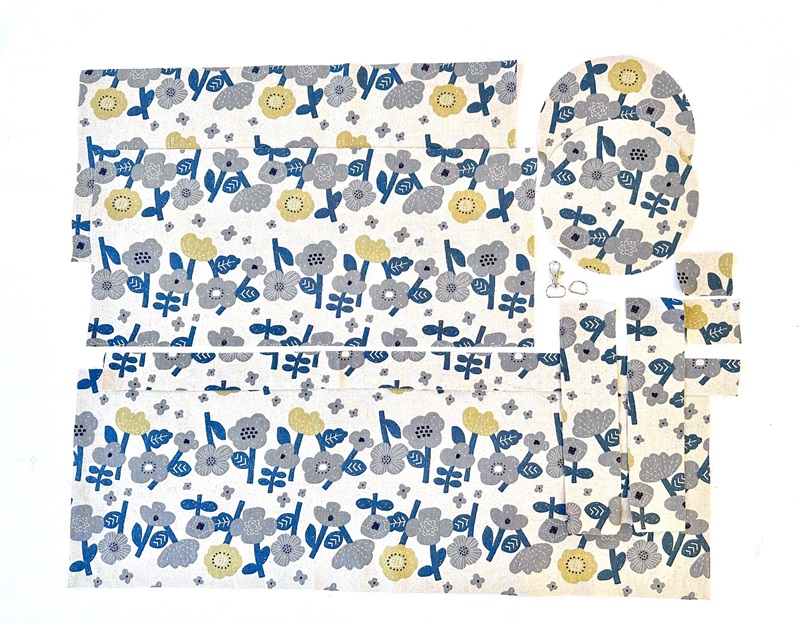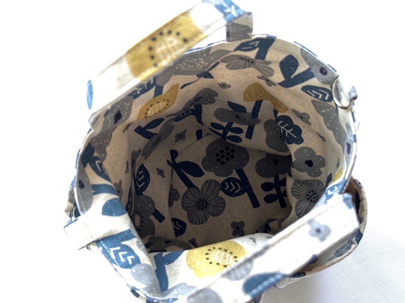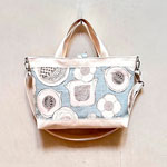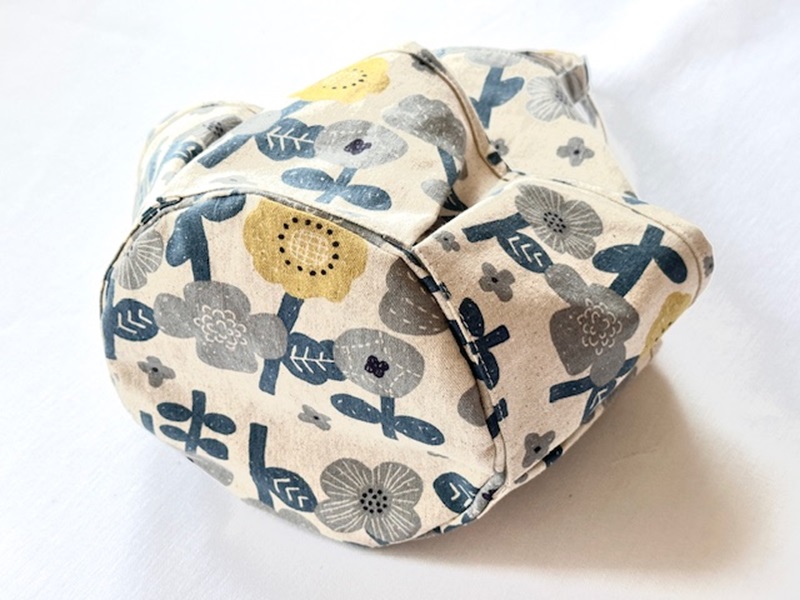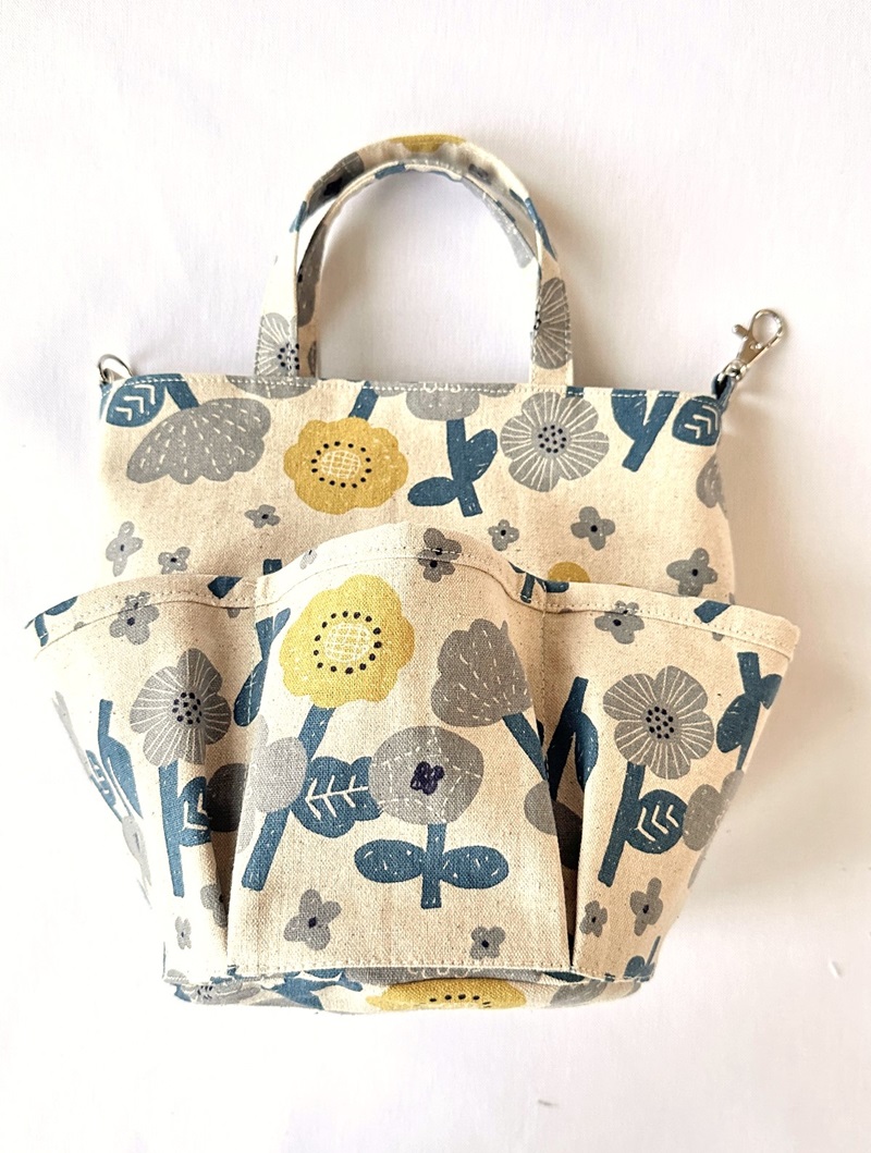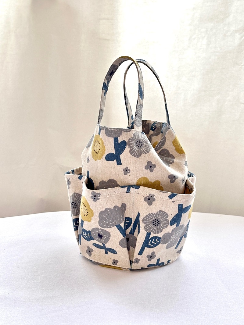 This is a round-bottomed bag surrounded with pockets. The fabric used for this bag is a floral pattern from the “KNAP” series. The cotton linen canvas is easy to sew and suitable for bag making.