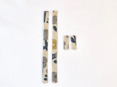 With the front sides facing outside, fold the handle in four and sew. Make the tab following the same process.