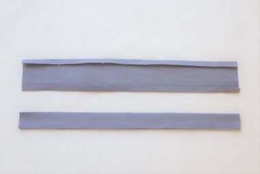 Fold the long ends of the handle for 1cm. With the front sides facing outside, fold in half and sew both ends. Make two pieces.
