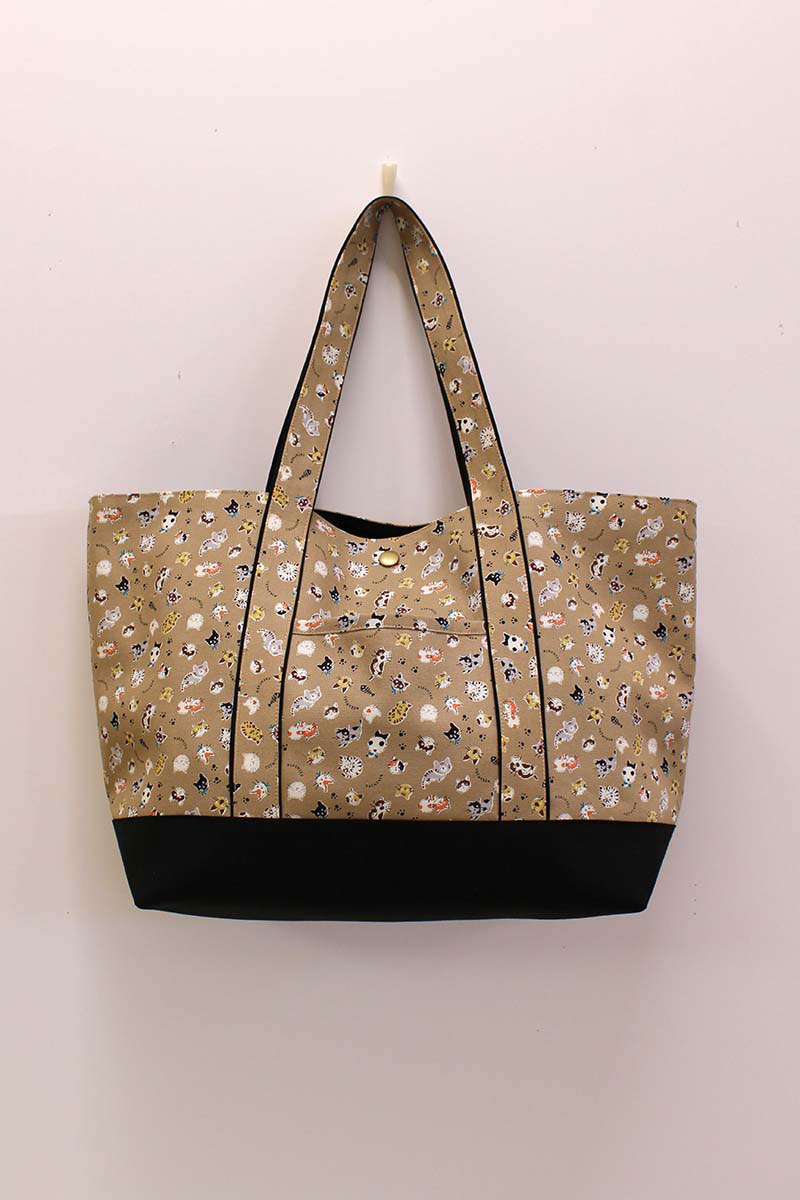 Designed with a transition between the top and bottom, this is a large tote bag that features a convenient outer pocket. A 100% cotton oxford print fabric with various kitties is from the Petits amis small buddy series. It is perfect for bag making as small print patterns cover the entire fabric, allowing you to use the fabric with flexibility.