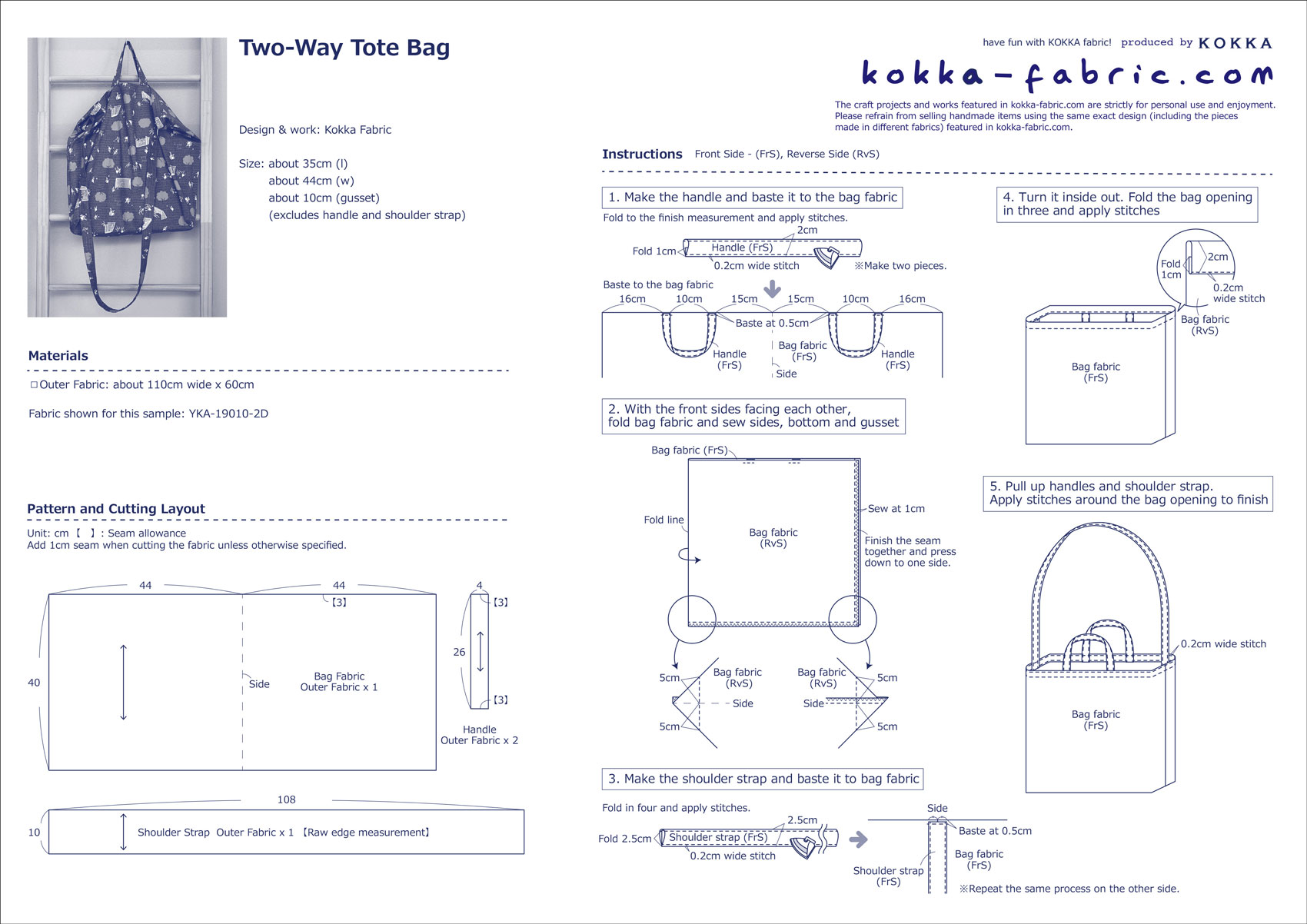 This two-way bag can be used as a tote bag or a shoulder bag. The fabric used for this bag is from the “Petite École” series. Designed with a mature feel, it is a great bag not just for kids but also sports loving adults. The 100% cotton oxford is ideal for bag making. This fabric is easy to handle even for sewing beginners.