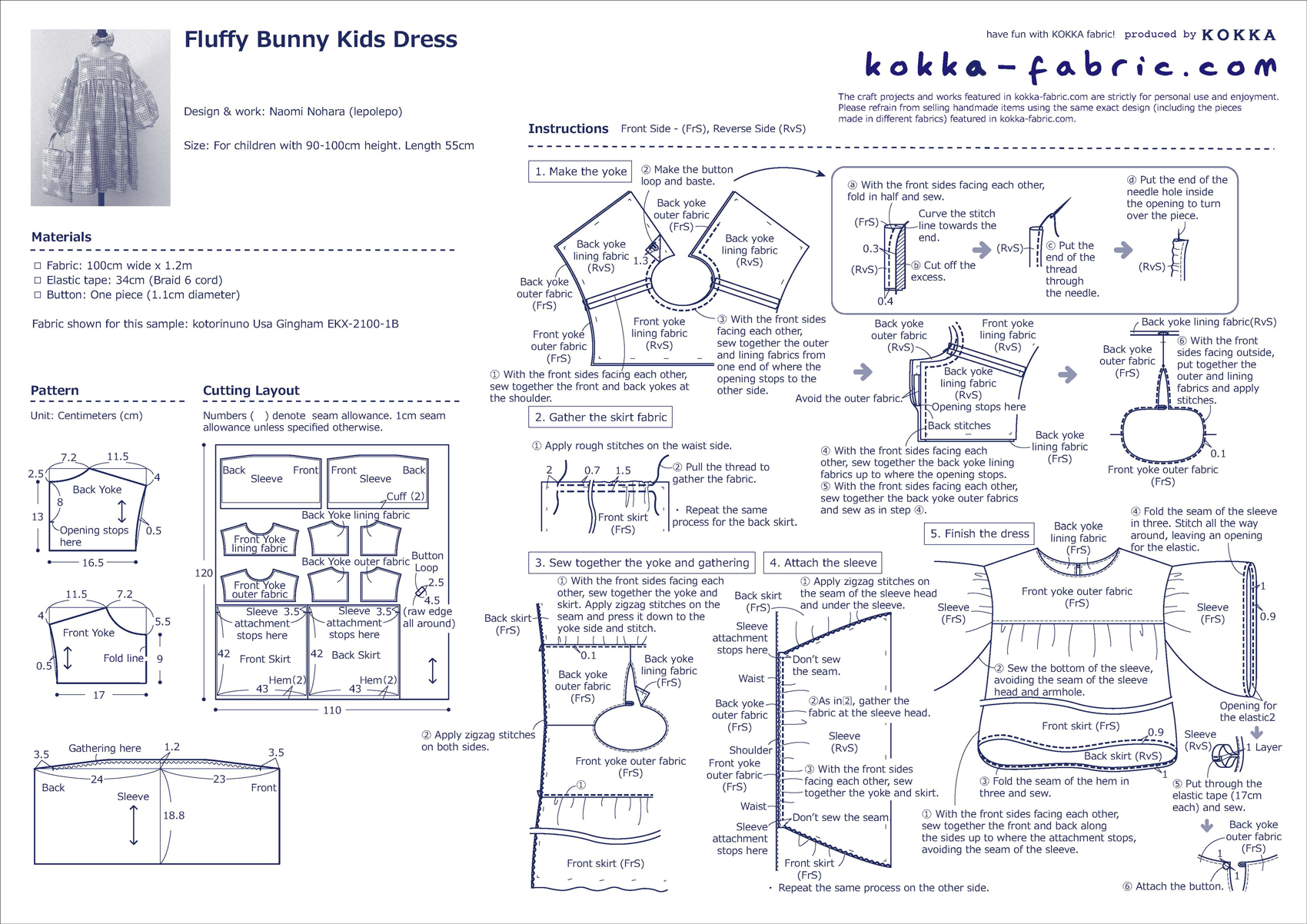 This kids dress incorporates yokes and ample gatherings, featuring lovely voluminous sleeves. For this dress, the Usa Gingham from the kotorinuno series is used. This textile brand presents the exclusive design by the craft artist, trikotri who is known for the Dobutsu (animal) Pom Pom felt animal mascots.