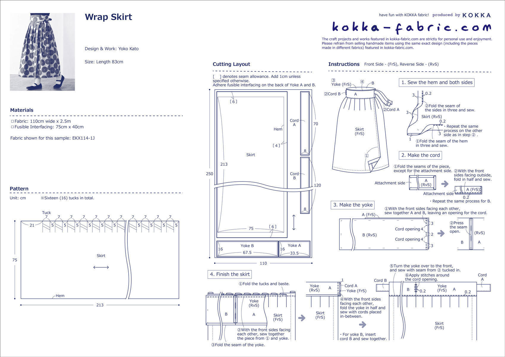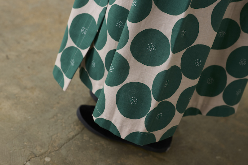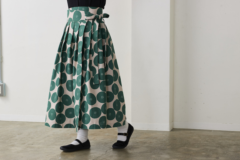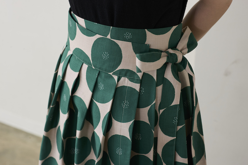 This tucked wrap skirt is accented with a ribbon tied tightly at the waist. The wide yoke creates a slimmer look around the stomach. You can also wear it stylishly with a top tucked in. The fabric used for this skirt is the Anpan pattern from the “MUDDY WORKS” standard collection. This 100% lightweight cotton canvas cloth has moderate thickness, which makes it easy to cut and sew, even for sewing beginners.