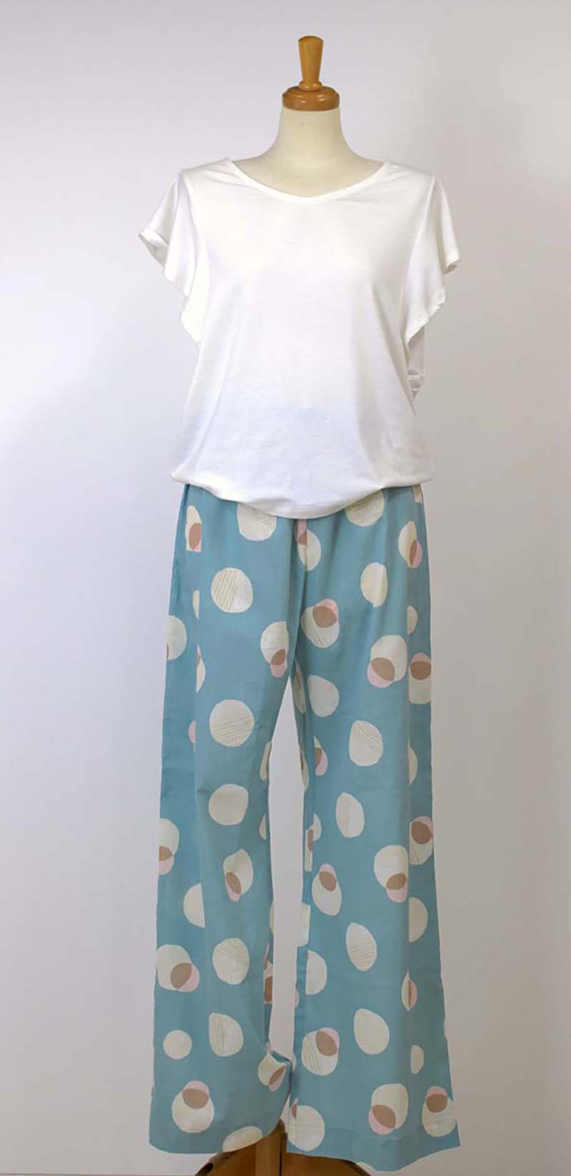 These comfortable, loose pants are perfect for relaxing at home. The fabric used is “Suteteko Kibun ♪”, a thin and soft 100% cotton Yoryu (Crepe de Chine) print. This fabric has unevenness called “shibo,” and the surface that comes into contact with the skin is small, so you can enjoy a silky feel. Since it is also highly absorbent and quick-drying, it will be very useful in the coming seasons. This is exactly the kind of material you want to use for making Suteteko, a Japanese version of relaxed-fit pants.