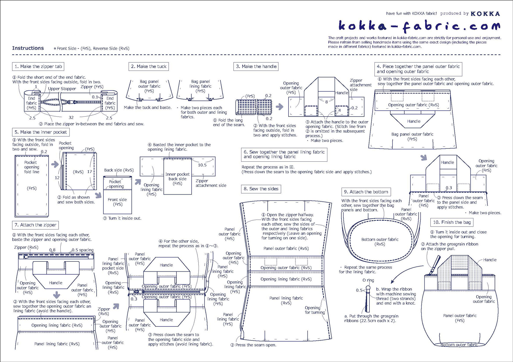 Please be mindful of the directions of the patterns and cut the fabric in the same direction. When turning over the end fabrics on the zipper through the opening, use a stiletto for a clean finish. The length of the handle can be adjusted to your taste. If you want to carry this like a shoulder bag, please cut longer pieces for the handle.