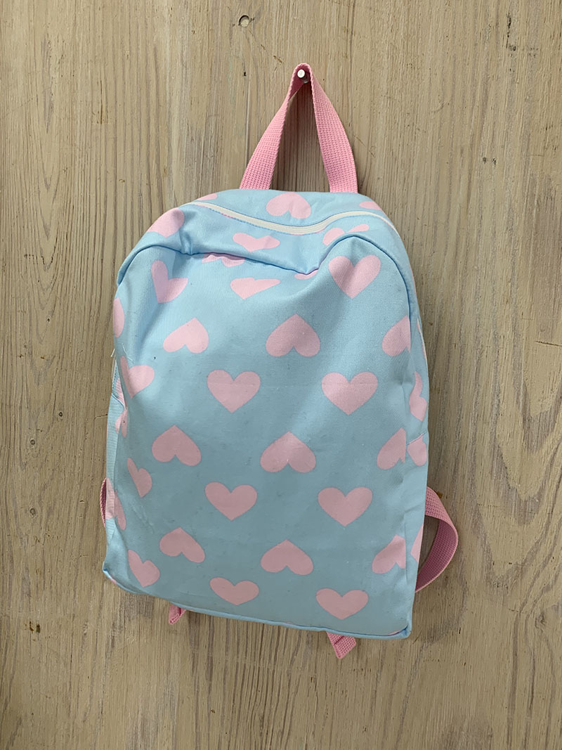 While this backpack is small, it comes with a 50cm long zipper, making it easy to open and close, even for small kids to store and carry their own items. The heart design fabric in a pastel blue and baby pink combination is from the teiban series. The acrylic tape in the same color makes the bag even lovelier.