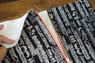 Fold four edges of the zipper to the lining side and baste it by hand stitching.