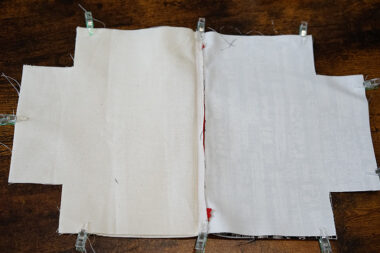 With the front sides facing each other, sew together the outer fabric piece from step 3 and lining fabric with 0.7cm seam allowance.