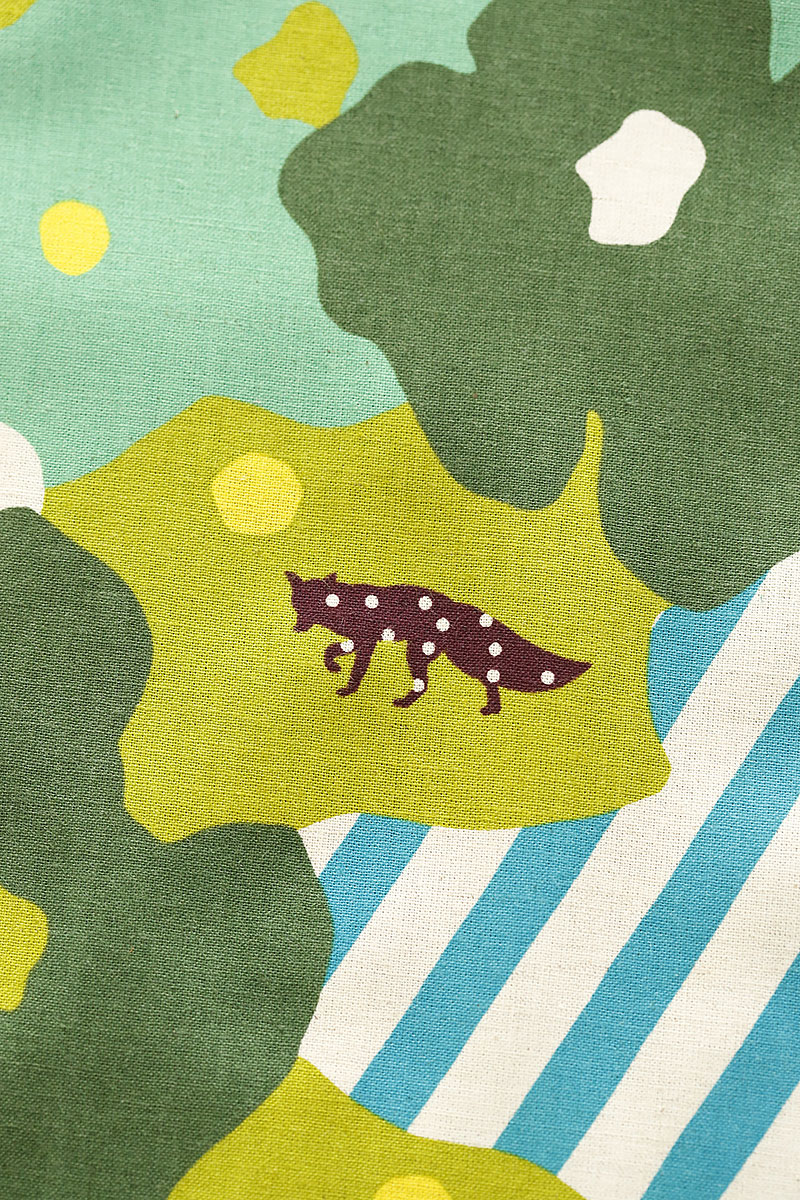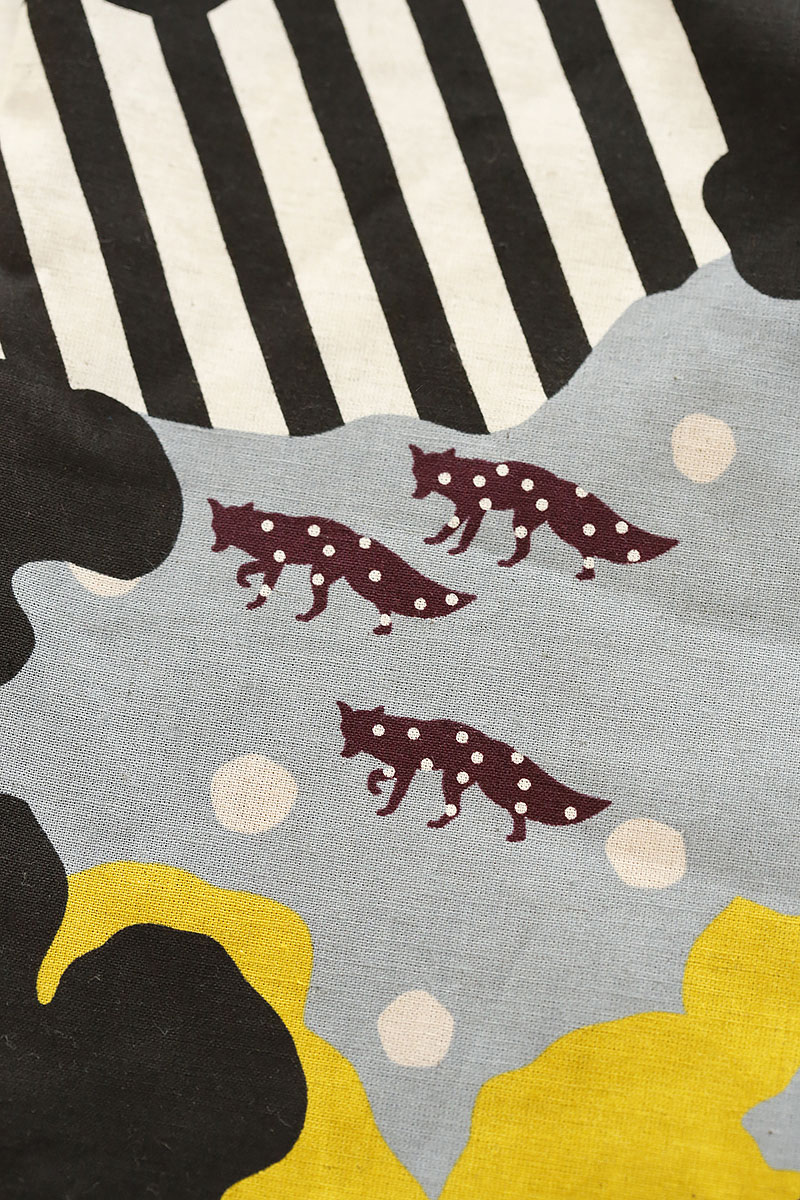 Flowers, stripes and dots adorn the camouflage. Amidst these motifs you find a group of foxes trying to blend in the background as a camouflage themselves.