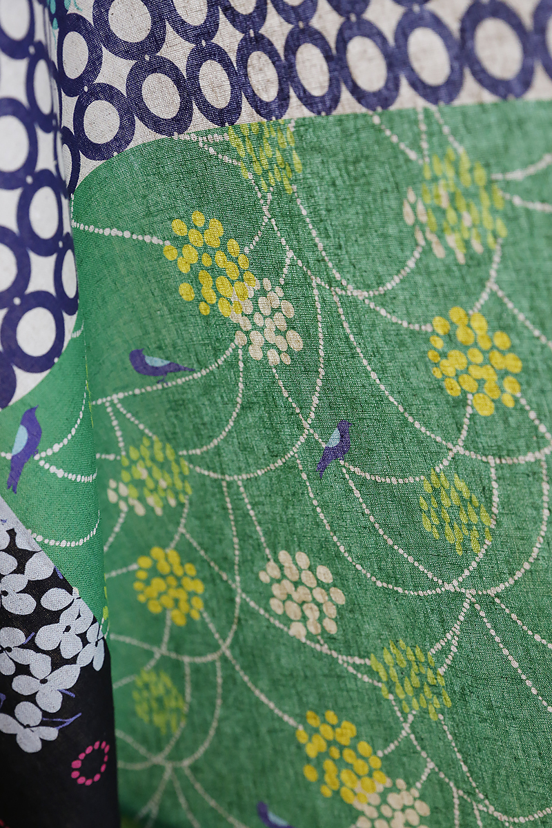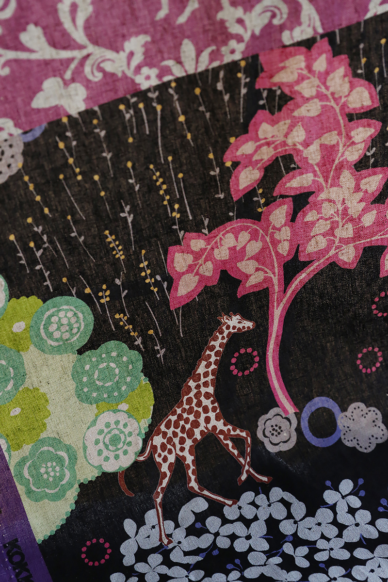The bright and clear scenery spans with a layer of colors. It is like a feeling of deja vu. “I designed the landscape as the main image of the collection’s theme, ‘color journey’. The charm of this fabric can be best experienced by using the breadth of the fabric to its fullest.” (by Furuya)