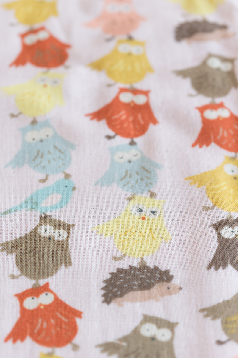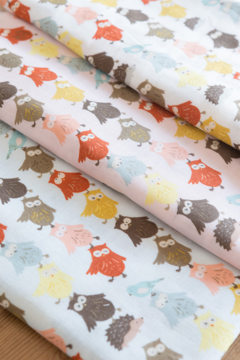 A popular animal motif, the owl, is swinging and layering on top of each other. It looks like an owl stripe design. Looking at it closely, you may notice a bird on the owl’s head or an owl on top of a hedgehog. It is a cute and playful fabric. Since this is a double gauze material, why not make children’s clothing or a mask?