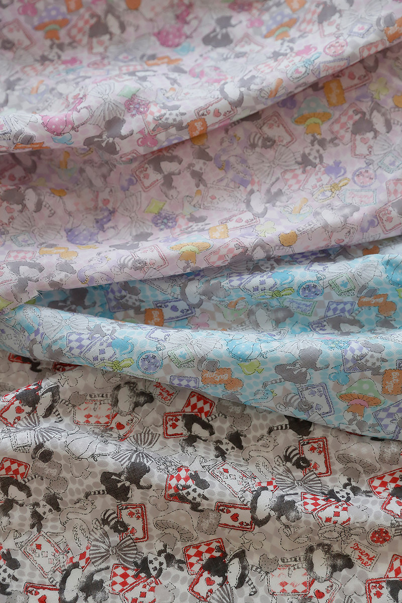 Alice-themed fabric is introduced backed by requests from customers. It is full of curious motifs that appear in the Alice in Wonderland stories. Along with the lovely tone of pastel, the Alice-like monotone with red (color D) is great.