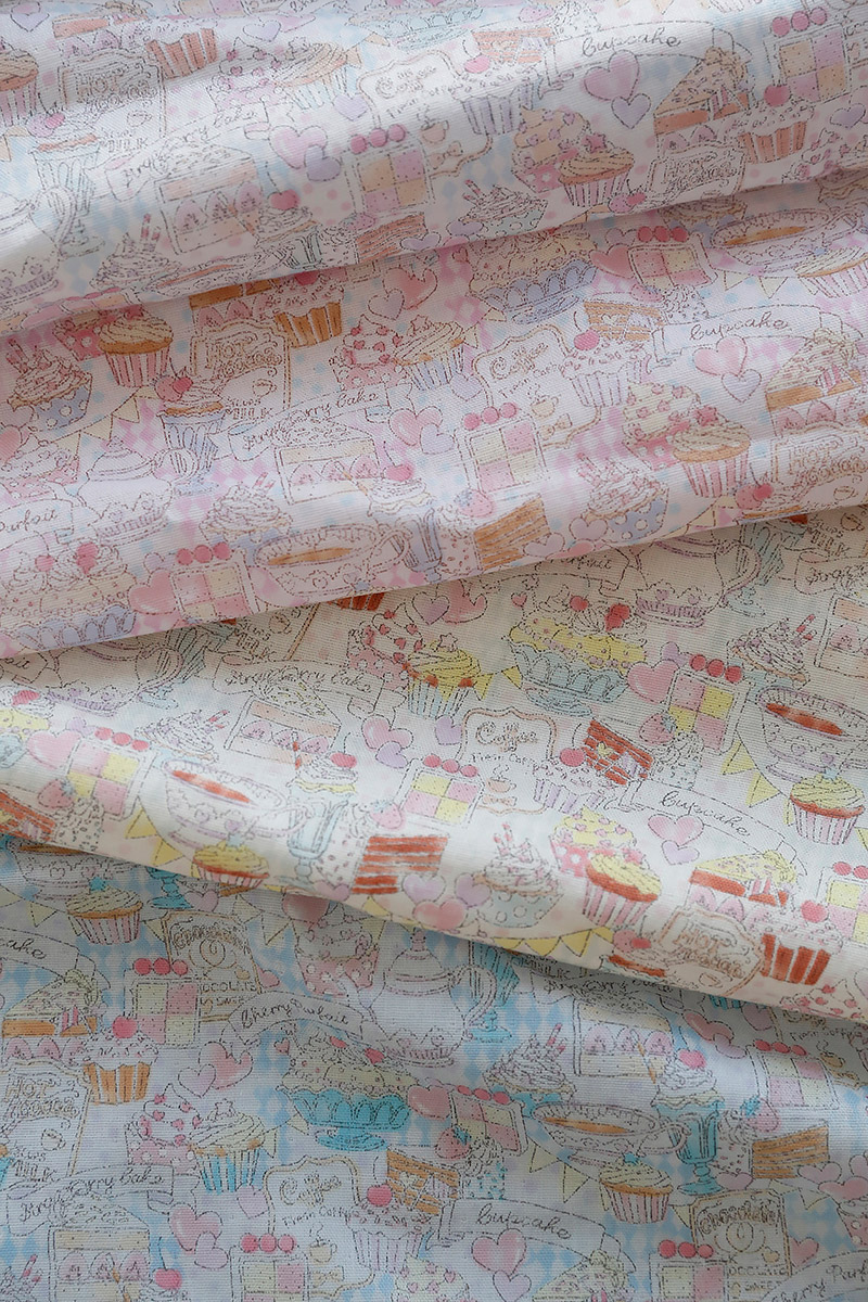 This design is themed after a tea party. The lively design of sweet cakes, balloons and garlands are drawn in fair touches, matching the soft taste of double gauze. It will be nice to make a girl’s dress with lots of frills in this fabric.