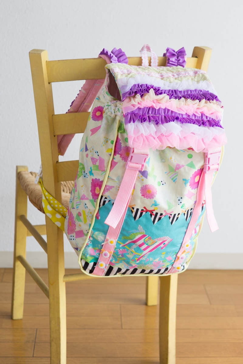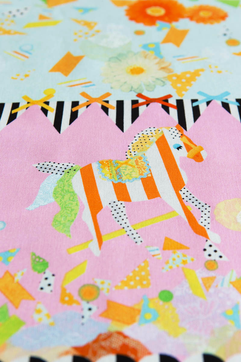Ribbons, fabrics and lace are represented in a collage. A stripe and lace motif create a fancy pony design. This easy-to-handle broadcloth is versatile, perfect for a dress or for small items. Adding a lining fabric or quilt batting will make it suitable for making bags such as a backpack. As shown in the photo, frilly ribbon embellishment can create a gorgeous yet cute look!