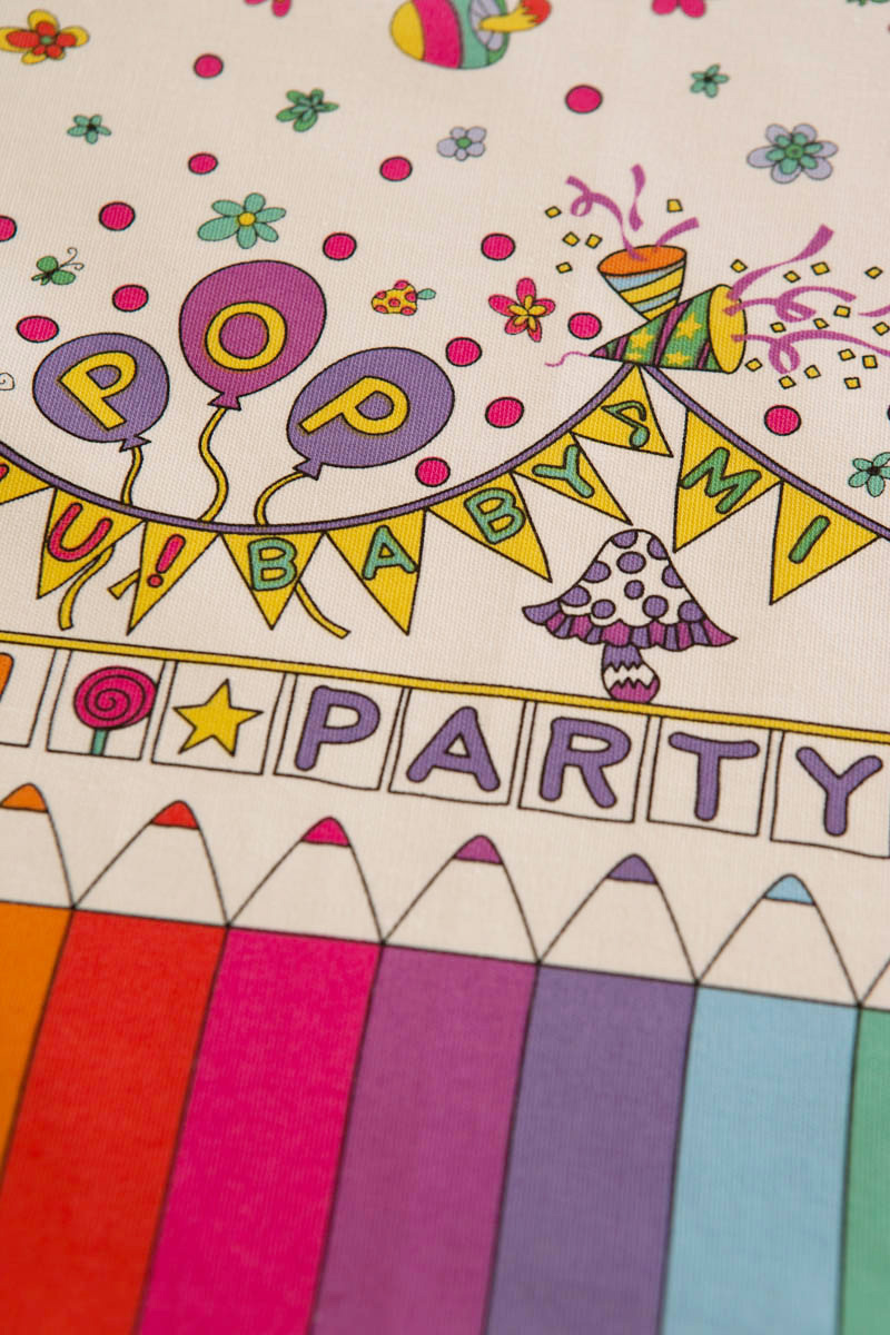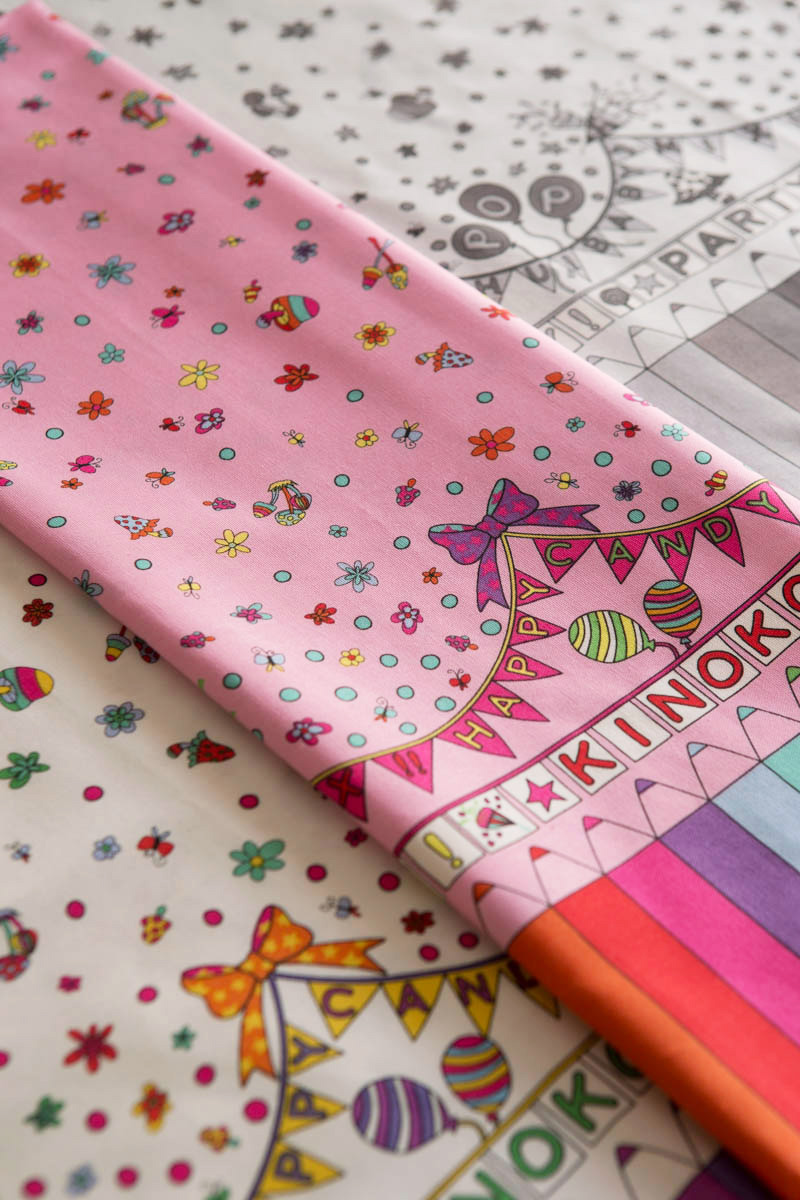 The name of this design is “CANDY PARTY!”, same as the name of this fabric’s design unit. “We wanted to recreate the feel at a party. All the motifs that are imagined in our heads were drawn by hand on paper. It comes in three color bases – white, pink and gray. The gray tones resulted in an interesting feel, making it look like a lining fabric.” (by Candy Party)