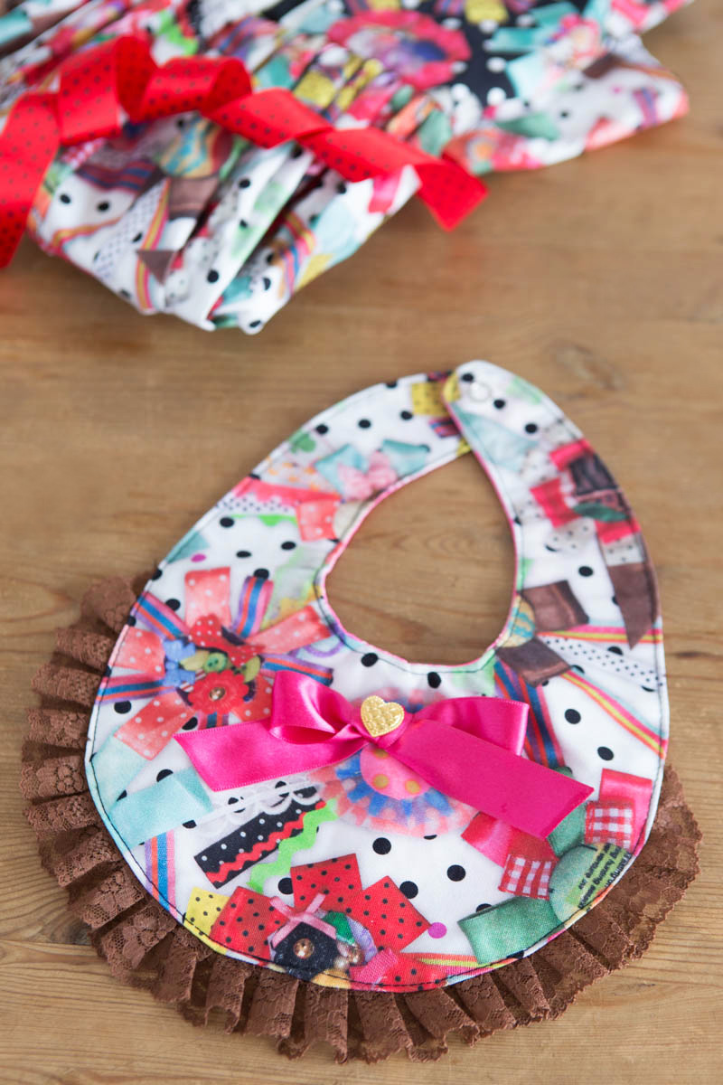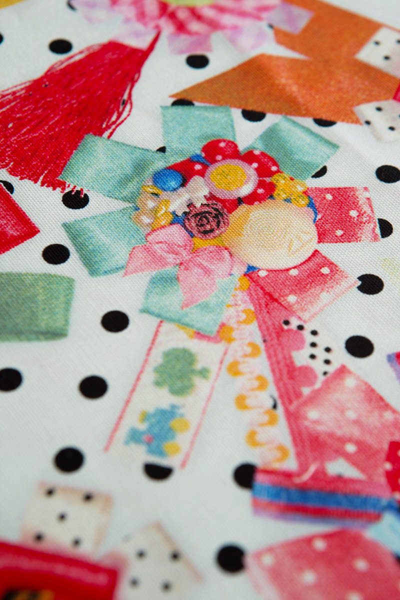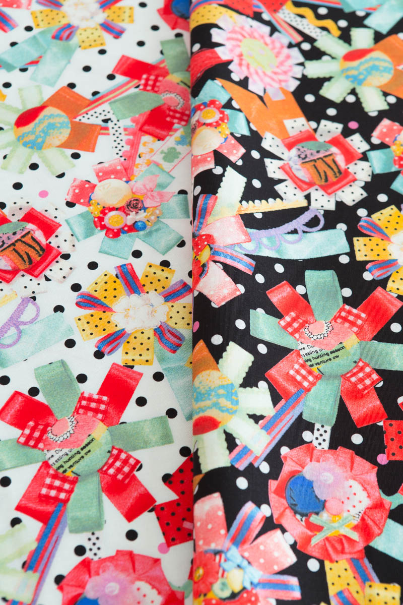 A rosette made by Candy Party’s member was turned into a fabric design. The motifs are spread across the fabric on the polka dot background. Wherever you cut it, every section of the fabric has a cute design. “You will notice a pink dot appearing here and there. We wanted to make the design a little playful. The original rosette is very intricately designed. Please take a close look to appreciate it!” (by Candy Party)