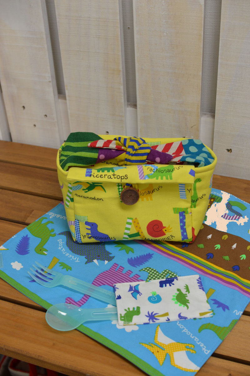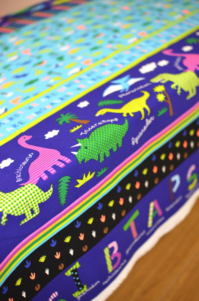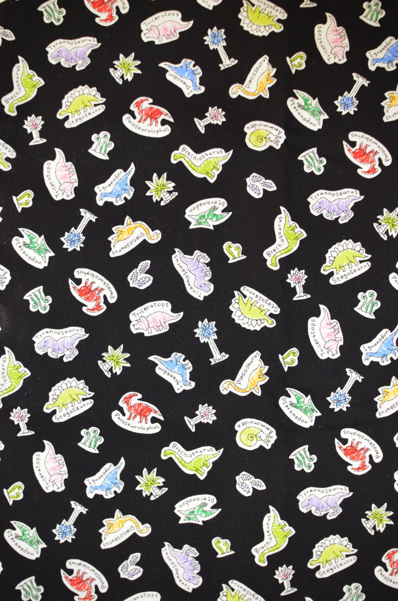 In Japan, the new school year starts in the spring time and many schools require certain types of handmade bags for students to carry. Beginning in the previous fall, parents start to get busy planning what types of school items they will make for the new school year. Kokka Fabric annually introduces a fabric series with characters perfect for these school goods. Today’s fabric, Dinosaur Land, will surely be loved by boys. Dinosaur is currently a very popular motif in Japan, seen everywhere from stickers, notebooks to a variety of stationery items. For a quick English lesson, alphabets and dinosaurs are blended into the design. This fabric is perfect not only for school bags but also for a bottled drink holder or a large bag that you can carry to afterschool football or baseball practices.