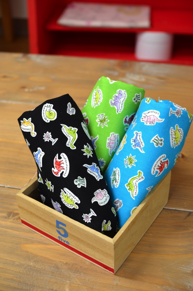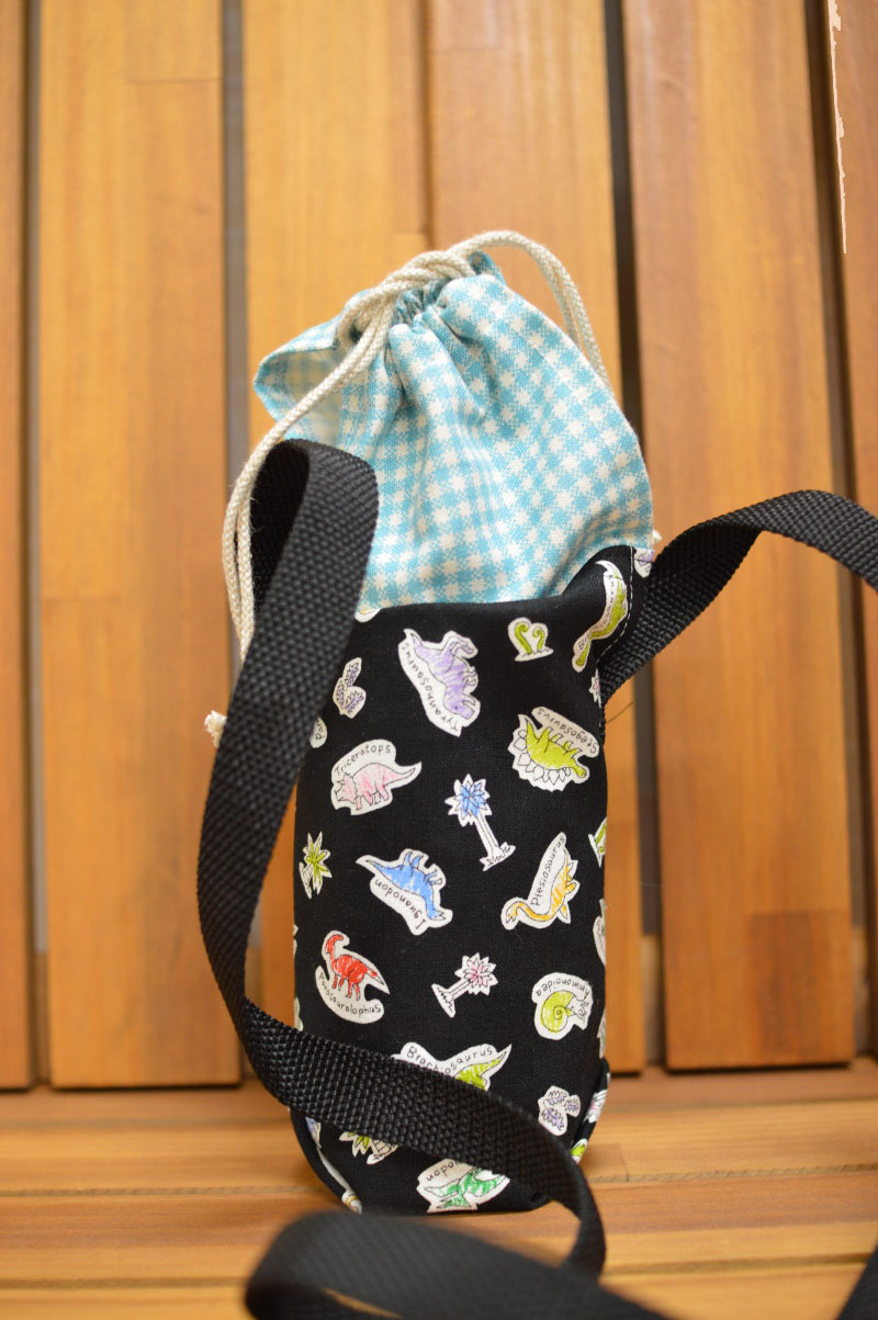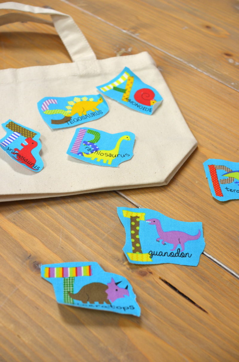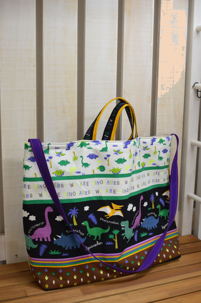 In Japan, the new school year starts in the spring time and many schools require certain types of handmade bags for students to carry. Beginning in the previous fall, parents start to get busy planning what types of school items they will make for the new school year. Kokka Fabric annually introduces a fabric series with characters perfect for these school goods. Today’s fabric, Dinosaur Land, will surely be loved by boys. Dinosaur is currently a very popular motif in Japan, seen everywhere from stickers, notebooks to a variety of stationery items. For a quick English lesson, alphabets and dinosaurs are blended into the design. This fabric is perfect not only for school bags but also for a bottled drink holder or a large bag that you can carry to afterschool football or baseball practices.