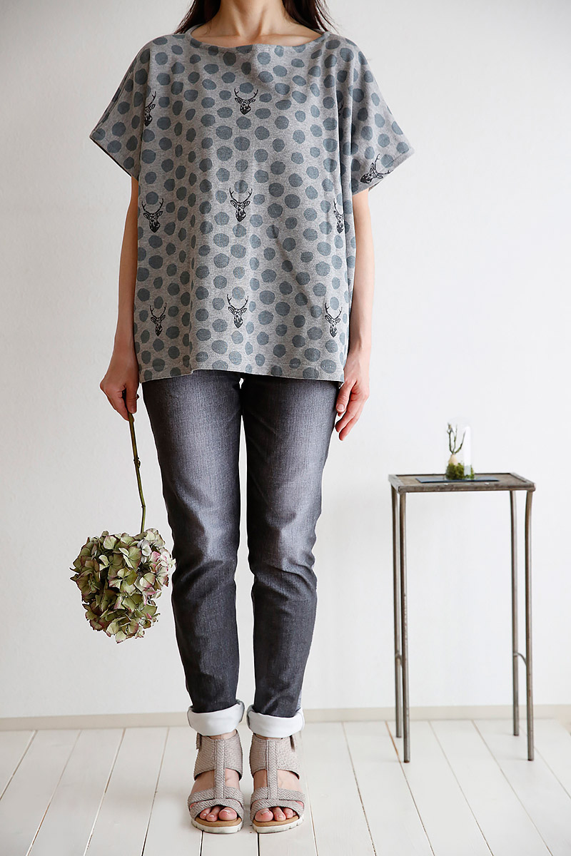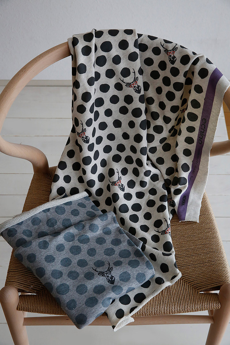 Whether it’s a somber grey or ivory, the dot and iconic deer create an accent, making this fabric versatile. From small goods to a T-shirt style oversized knit shirt, the items made with this fabric will look very stylish.