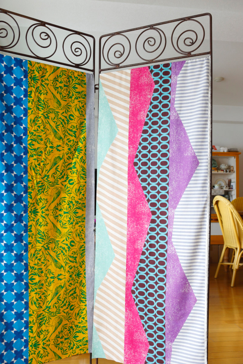 The name of this fabric is rhythm. The design spreads all the way to the edge of this 110cm-wide fabric. The plants and birds design, which reminds you of classic wallpaper, with systematic and unsystematic elements and a geometric pattern, are seamlessly connected with a rhythmical tone. Using a wide design section of the fabric can create a bold look. Taking advantage of the width of the fabric, this textile could be used for a tapestry or as room divider. Combining different color patterns will make great fabric panels or a lampshade.